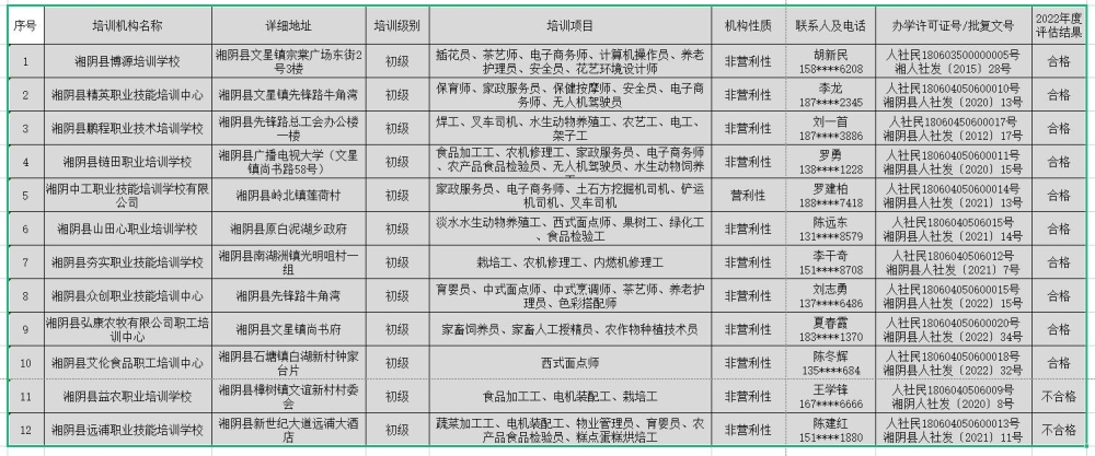湘阴县人社部门认定民办职业技能培训机构表