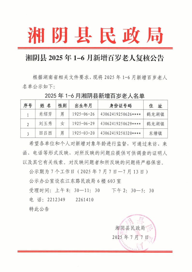 2025年1-6月新增百岁老人复核公告