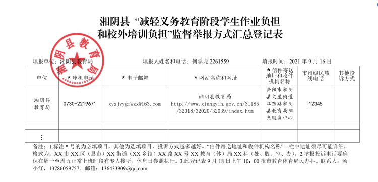 湘阴县“减轻义务教育阶段学生作业负担和校外培训负担”监督举报方式汇总登记表