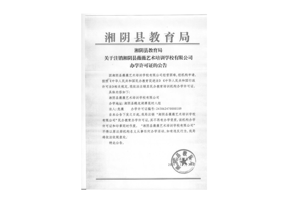 关于注销湘阴县薇薇艺术培训学校有限公司办学许可证的公告