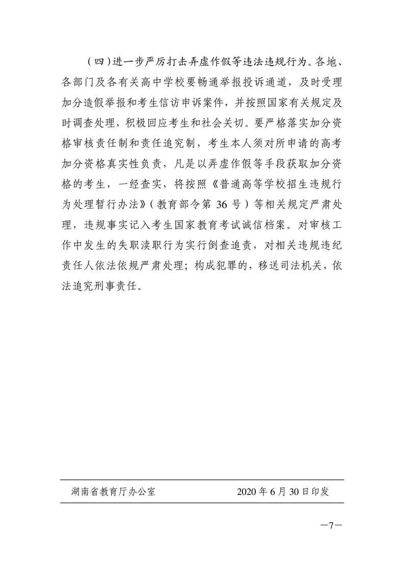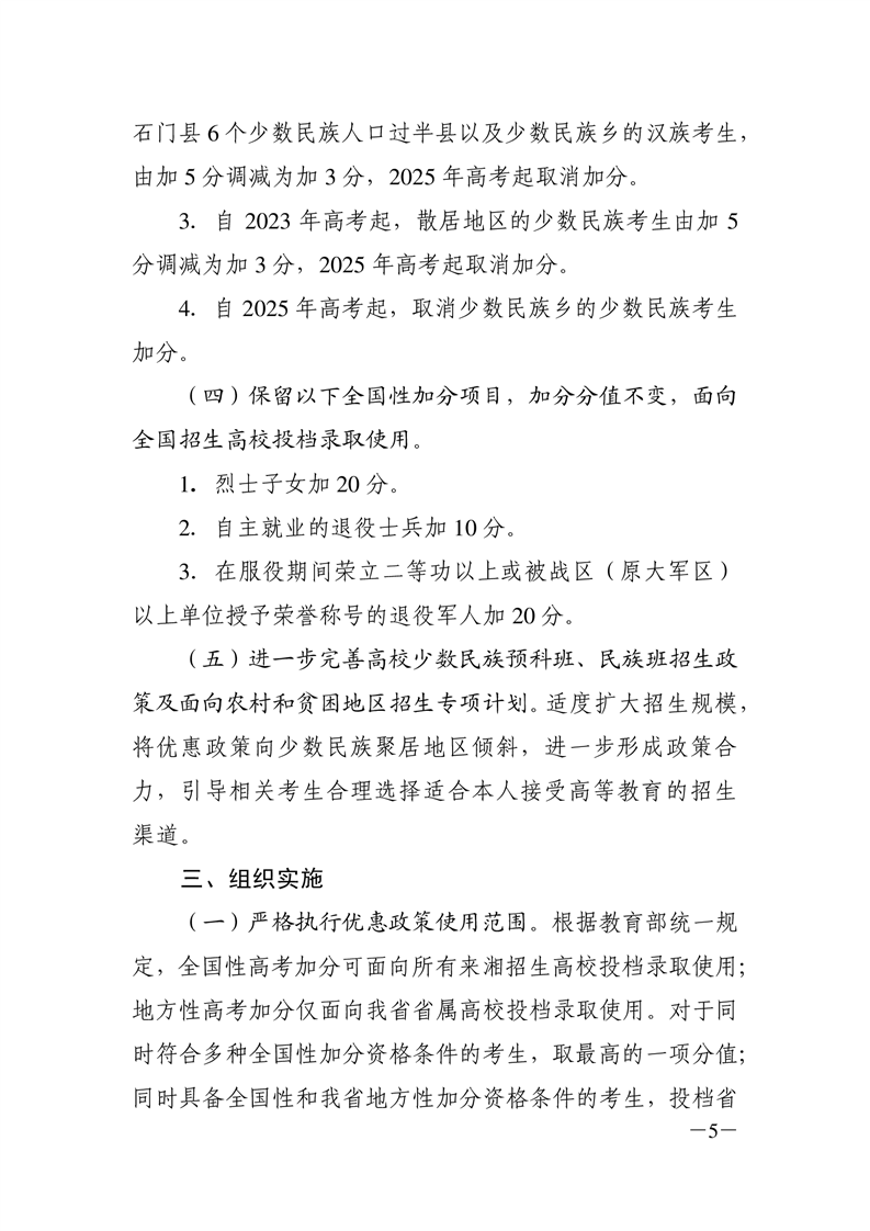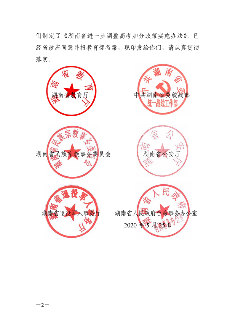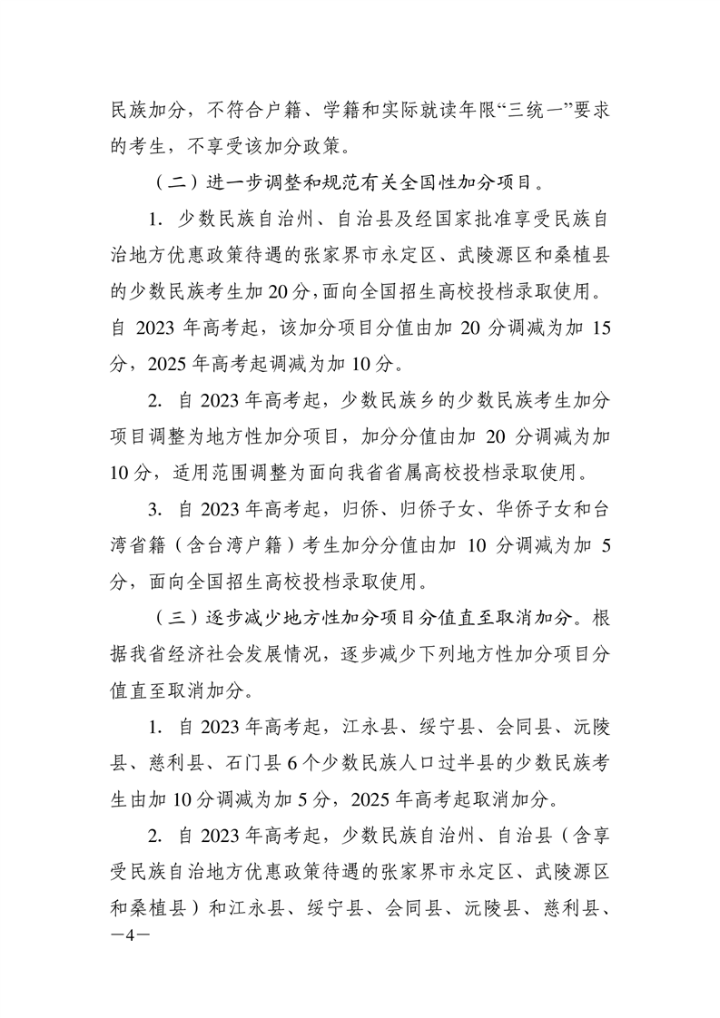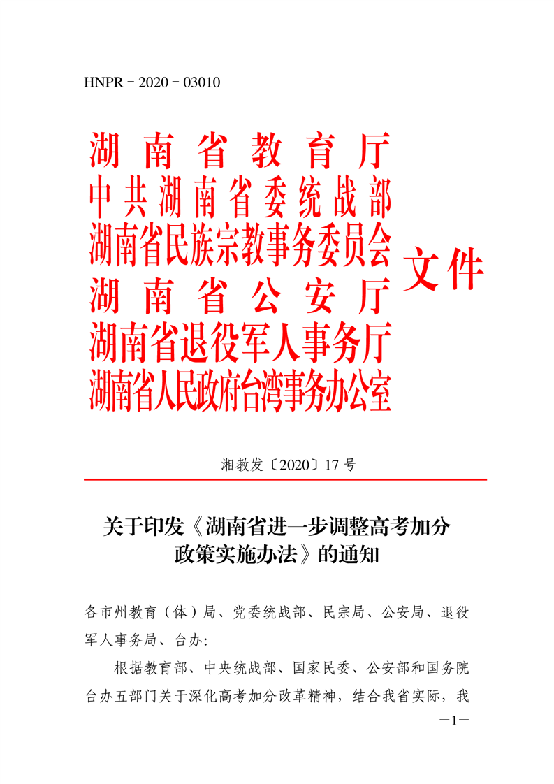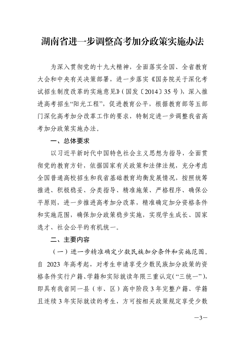 关于印发《湖南省进一步调整高考加分政策实施办法》的通知