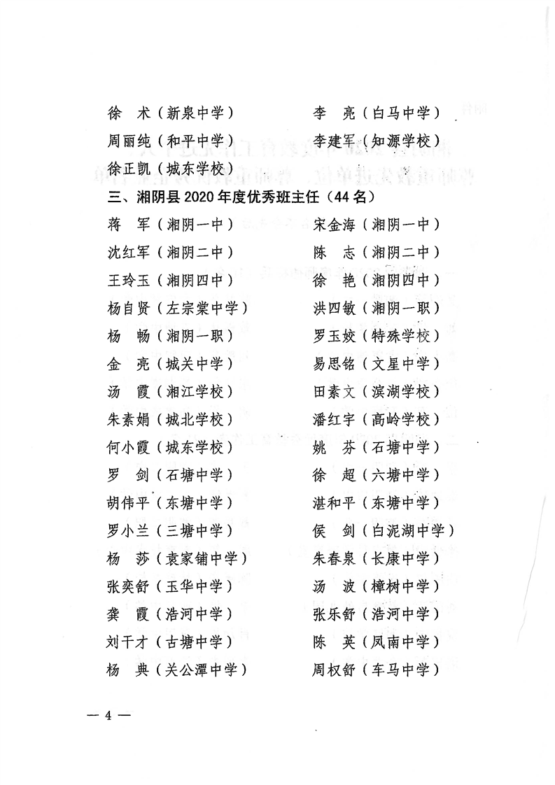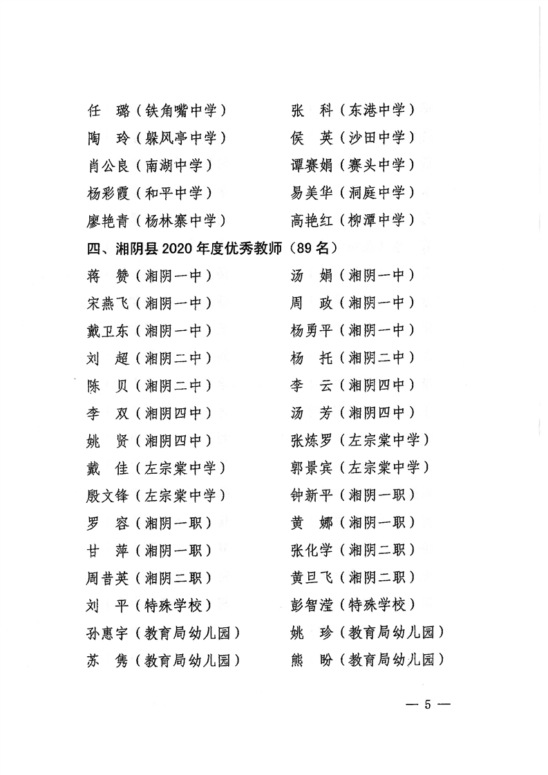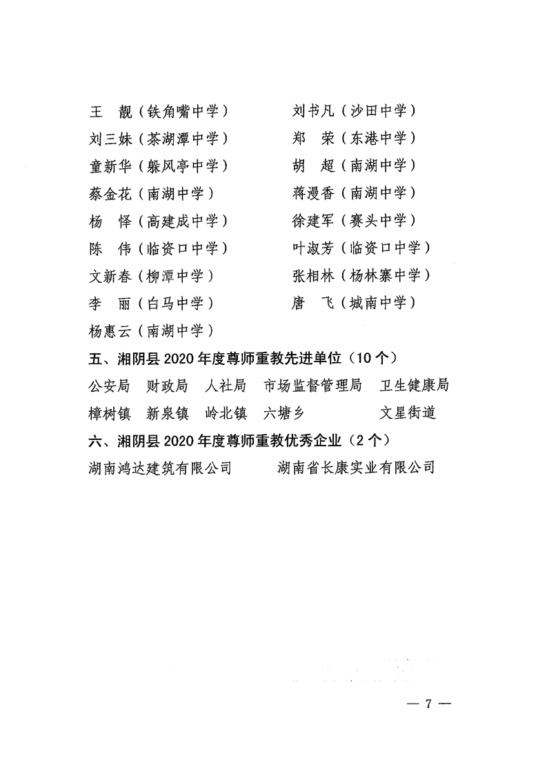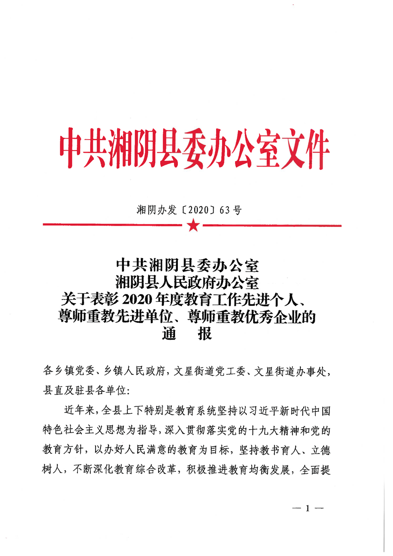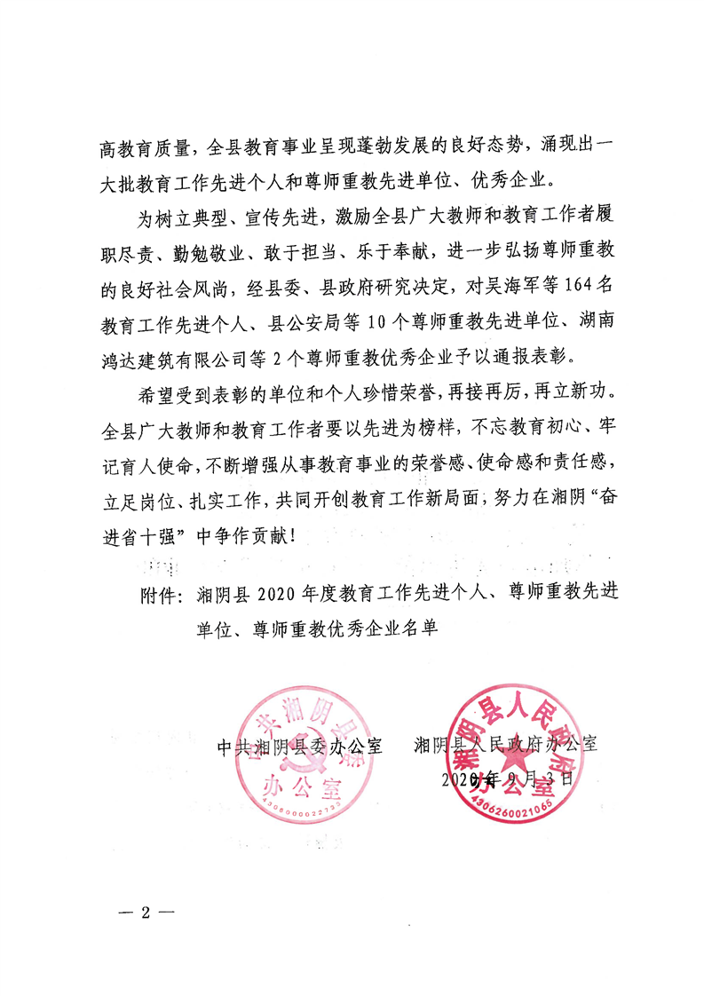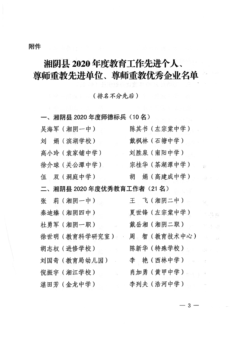 中共湘阴县委办公室 湘阴县人民政府办公室关于表彰2020年度教育工作先进个人、尊师重教先进单位、尊师重教优秀企业的通报