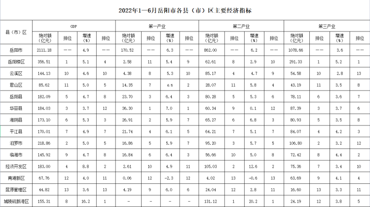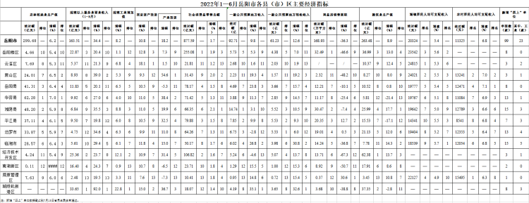 2022年1-6月岳阳市各县(市)区主要经济指标