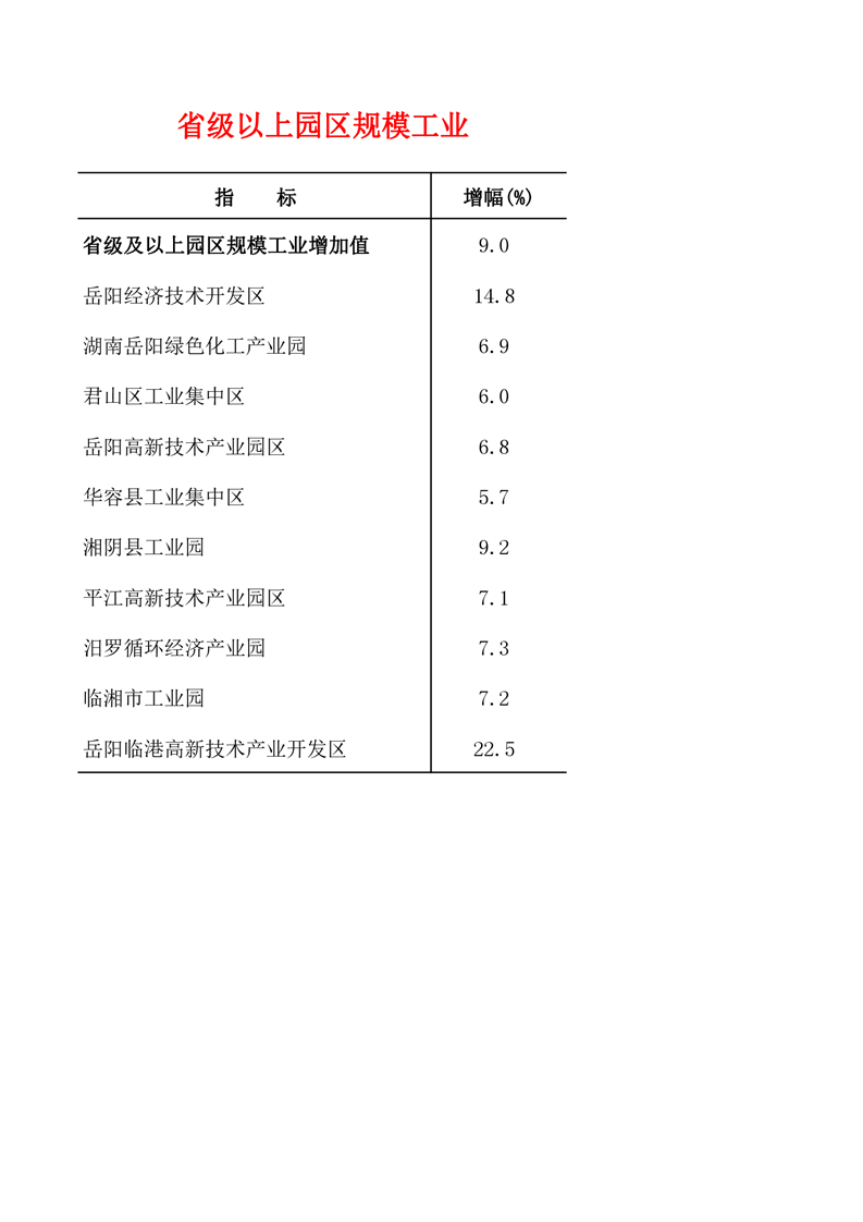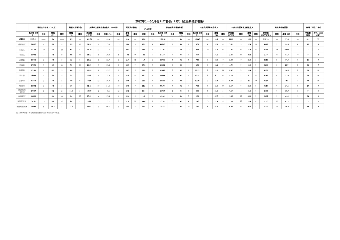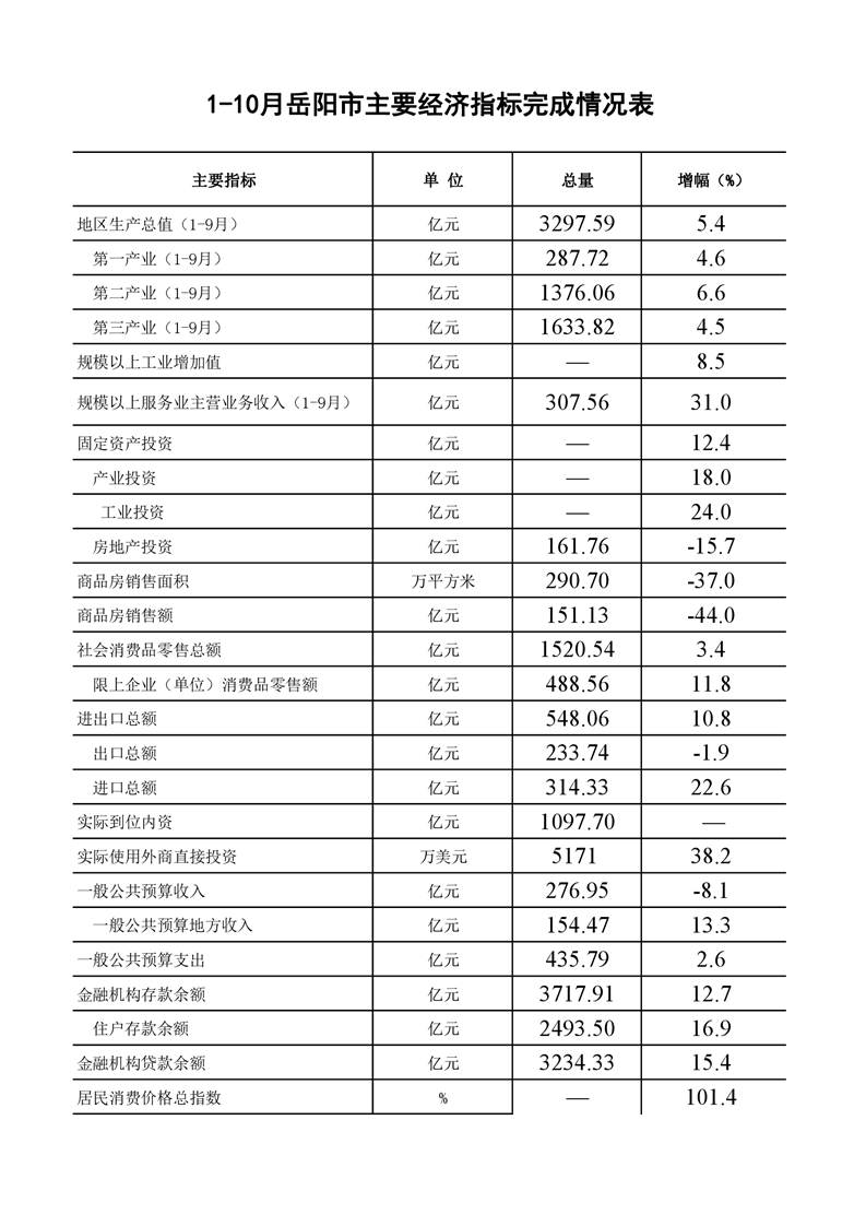 2022年1-10月岳阳市主要经济指标完成情况表