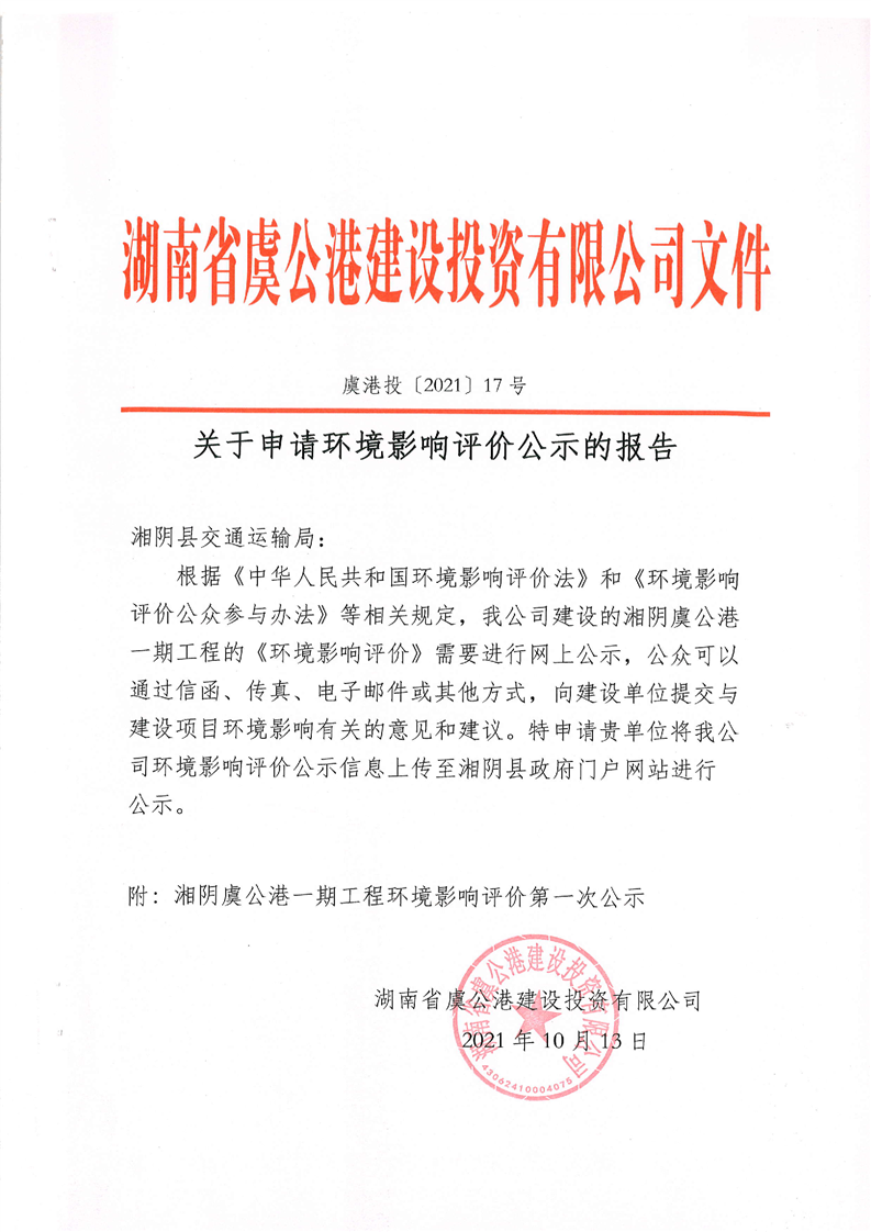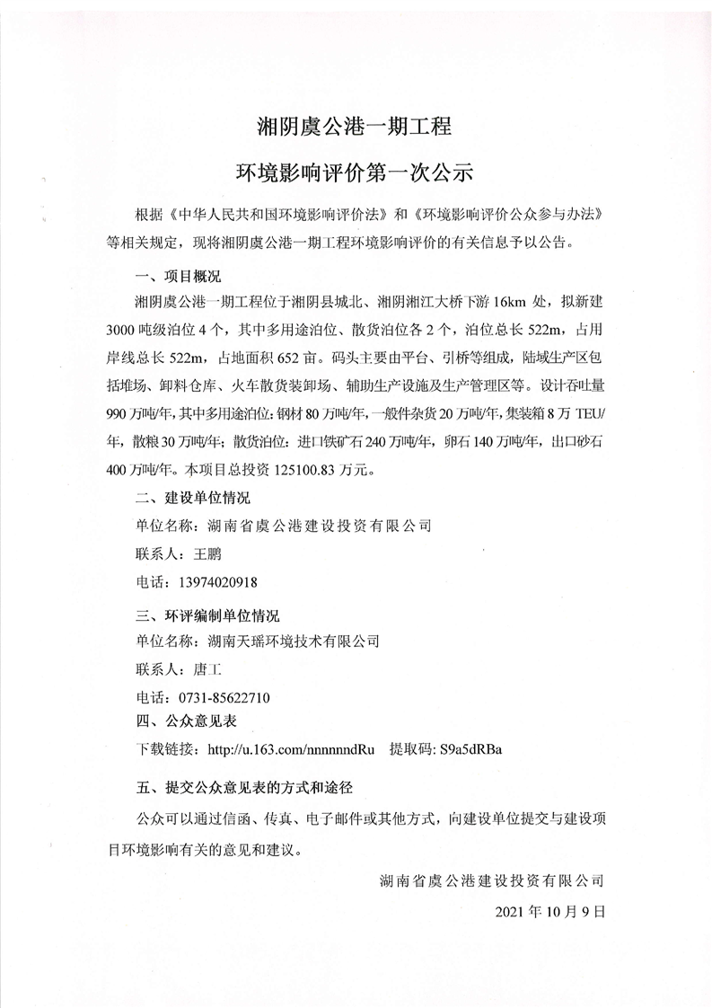湘阴虞公港一期工程环境影响评价第一次公示