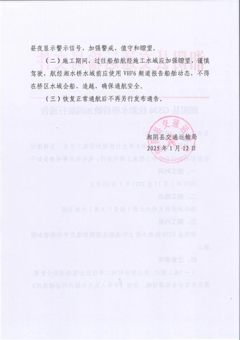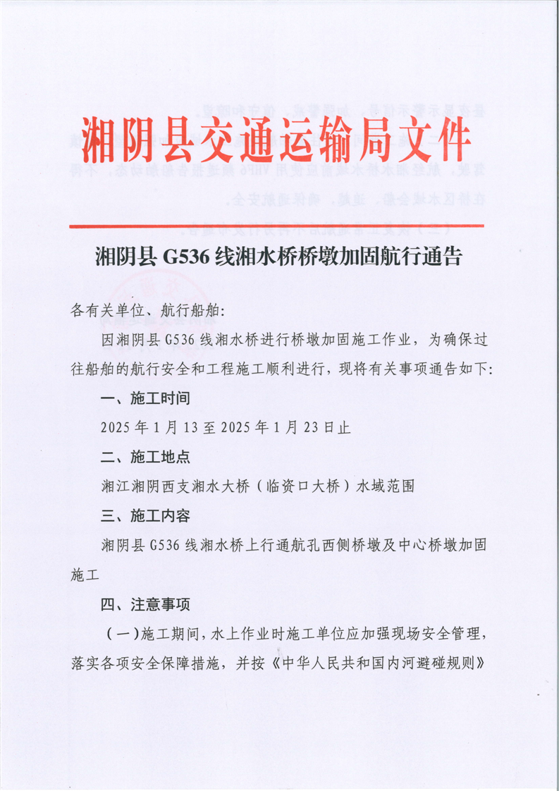 湘阴县G536线湘水桥桥墩加固航行通告