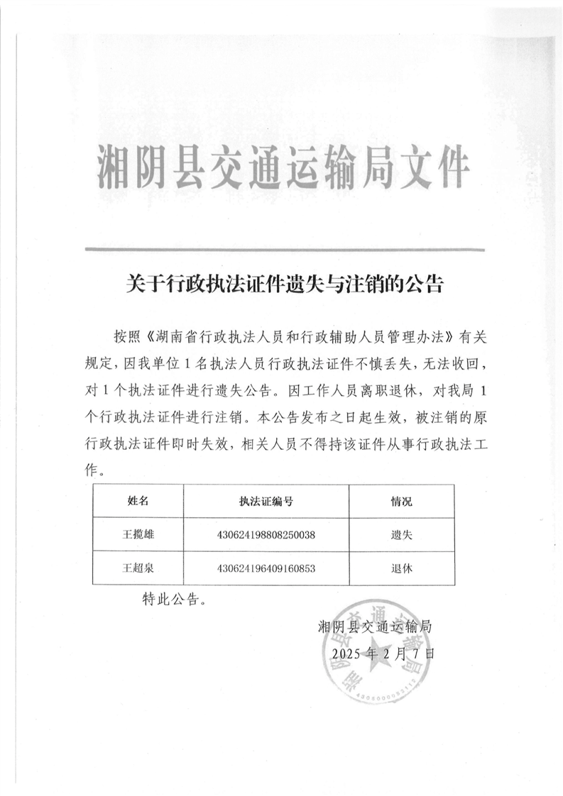 关于行政执法证件遗失与注销的公告