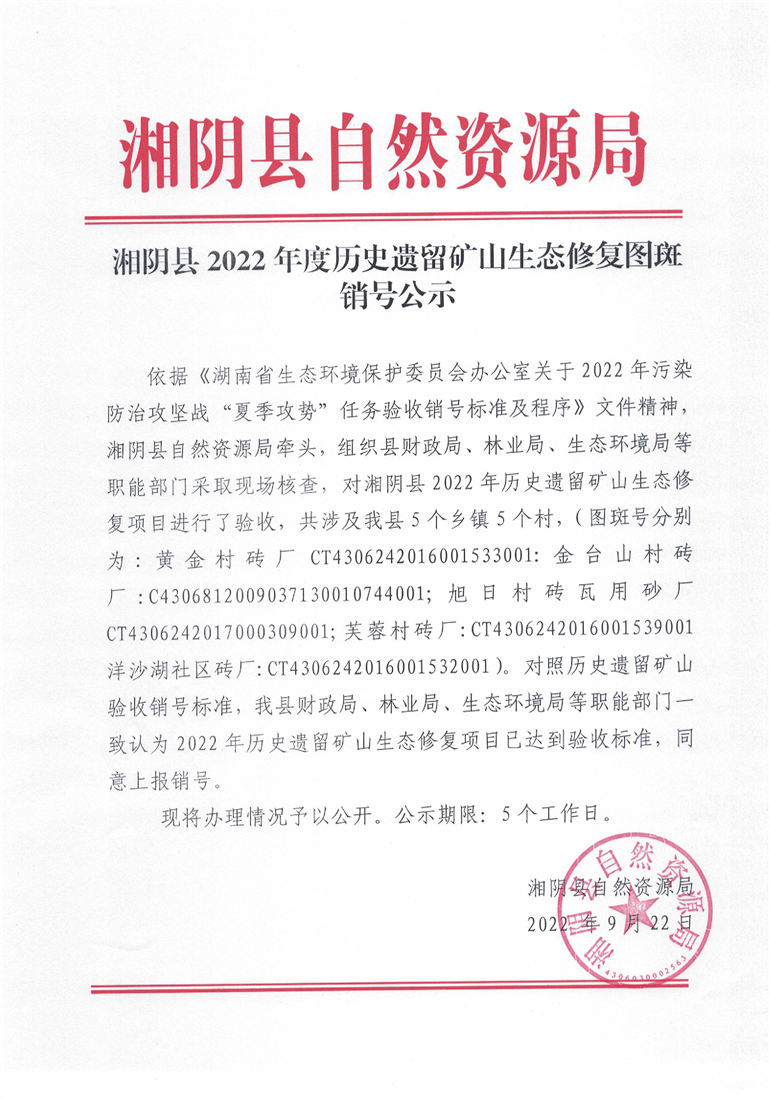 湘阴县2022年度历史遗留矿山生态修复图斑销号公示