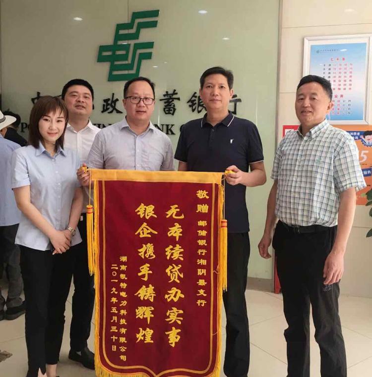 2019年6月3日,湖南凯特电力科技有限公司的张总亲自来到中国邮政储蓄银行湘阴县支行,送上写有“无本续贷办实事,银企携手铸辉煌”的锦旗,衷心感谢邮储银行湘阴县支行在该企业申请续贷过程中给予的贴心服务与政策指导。