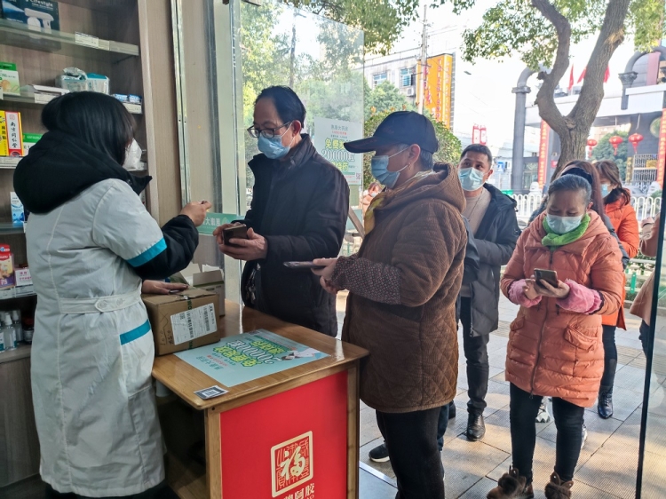 在惠康大药房内,前来免费领取退烧药品的群众络绎不绝,工作人员耐心地为他们说明药品注意事项,提醒安全服用。