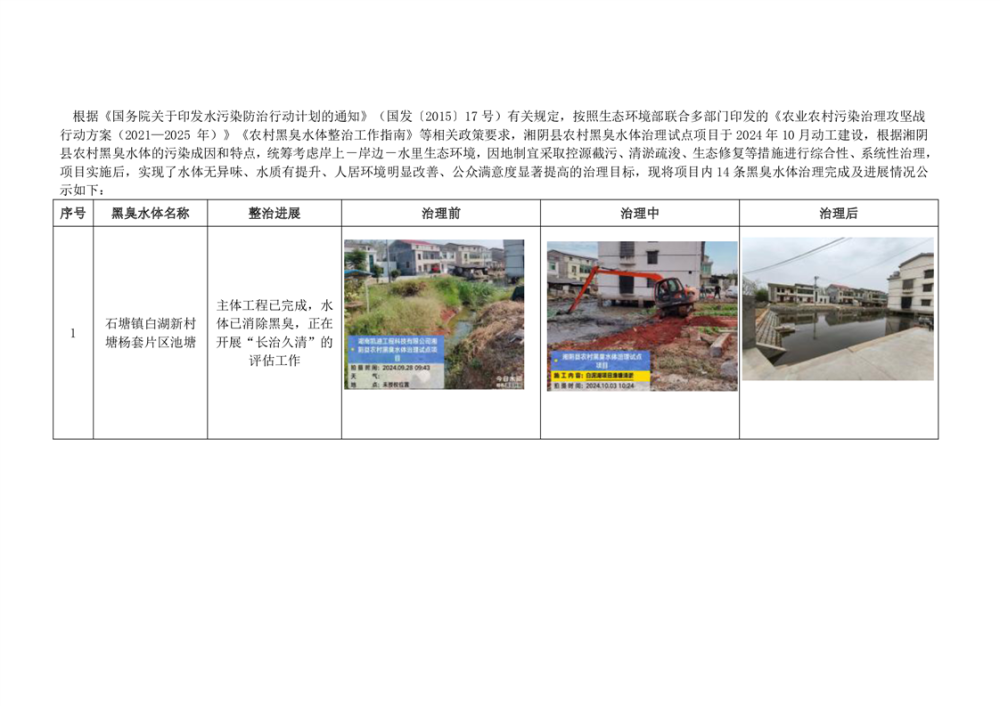 关于湘阴县农村黑臭水体治理试点项目完成情况及进展公示