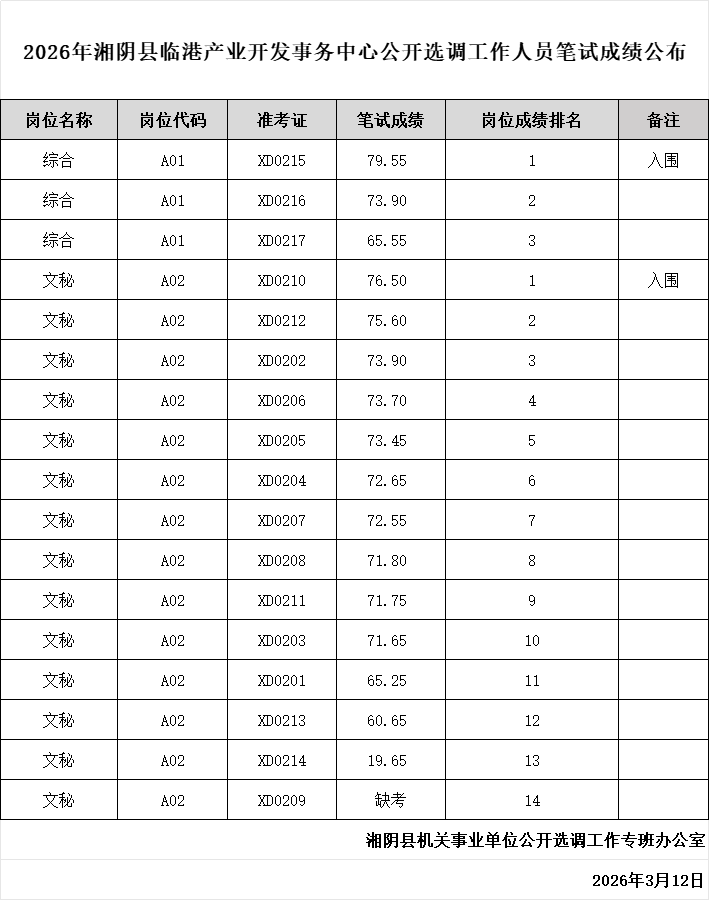 2026年湘阴县临港产业开发事务中心公开选调工作人员笔试成绩公布