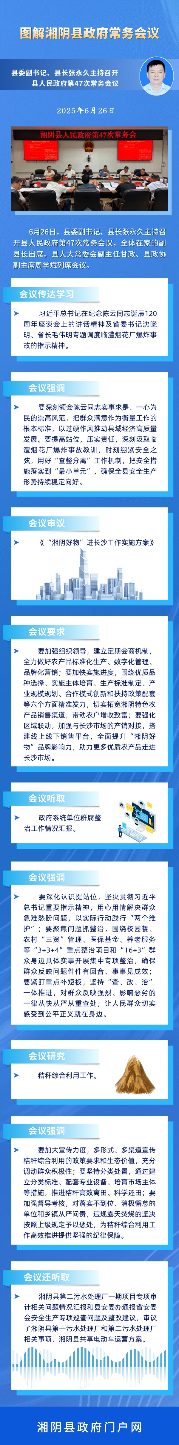 会议审议了《“湘阴好物”进长沙工作实施方案》。会议要求,要加强组织领导,建立定期会商机制,全力做好农产品标准化生产、数字化管理、品牌化营销;要加快实施进度,围绕优质品种选择、实施主体培育、生产标准制定、产业规模规划、合作模式创新和扶持政策配套等六个方面精准发力,切实拓宽湘阴特色农产品销售渠道,带动农户增收致富;要强化区域联动,加强与长沙市场的产销对接,搭建线上线下销售平台,全面提升“湘阴好物”品牌影响力,助力更多优质农产品走进长沙市场。