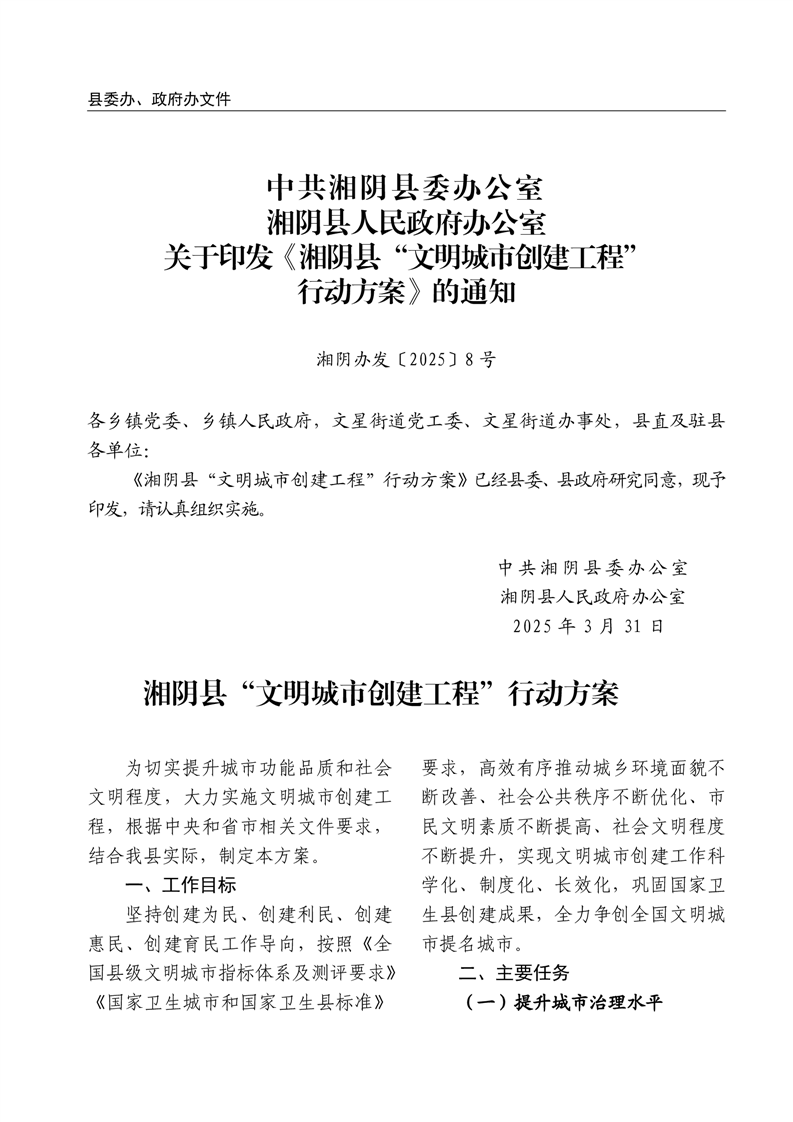 关于印发《湘阴县“文明城市创建工程”行动方案》的通知