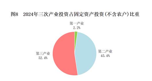在固定资产投资中,第一产业投资比上年下降67.3%,占固定资产投资比重为2.2%,比上年降低4.9个百分点;第二产业投资下降10.9%,占固定资产投资比重为45.4%,降低8.6个百分点;第三产业投资增长42.5%,占固定资产投资比重为52.4%,提高13.5个百分点。