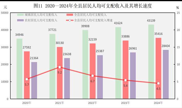 全年全县居民人均可支配收入35416元,比上年增长4.5%。其中城镇居民人均可支配收入43139元,增长3.6%;农村居民人均可支配收入28404元,增长5.4%。
