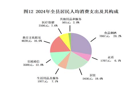 全县居民人均消费支出27878元,比上年增长4.3%。其中城镇居民人均消费支出30617元,增长4.6%;农村居民人均消费支出25390元,增长4.0%。全县居民食品烟酒消费支出占消费总支出的比重(恩格尔系数)为28.2%。