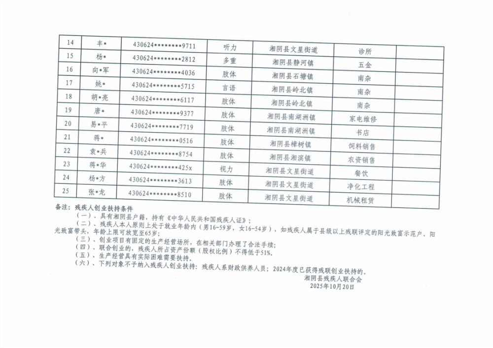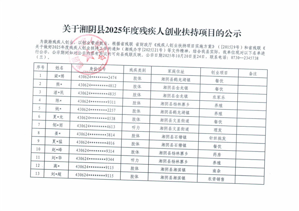 关于湘阴县2025年度残疾人创业扶持项目公示