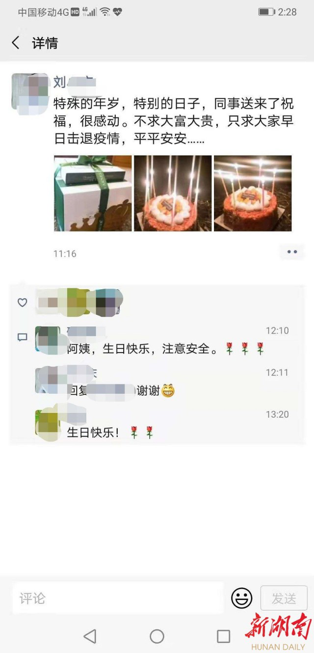 2月14日,是刘小庆进驻湘阴县人民医院感染科的第7天。12时许,刘小庆刚从感染科病房回到休息区,同事们拥簇着一个蛋糕边唱生日歌边朝她走来,包装精美的盒子上还贴着一张便笺:“祝在NCP救治一线的老婆生日快乐,早日平安胜利归来,永远年轻漂亮健康!”