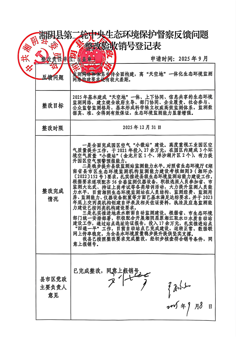 湘阴县第二轮中央生态环境保护督察反馈问题整改验收销号登记表
