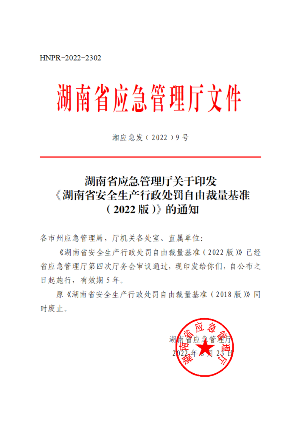 关于转发湖南省应急管理厅关于印发《湖南省安全生产行政处罚自由裁量基准(2022版)》的通知