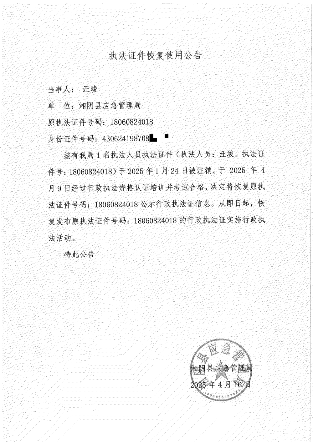 执法证件恢复使用公告