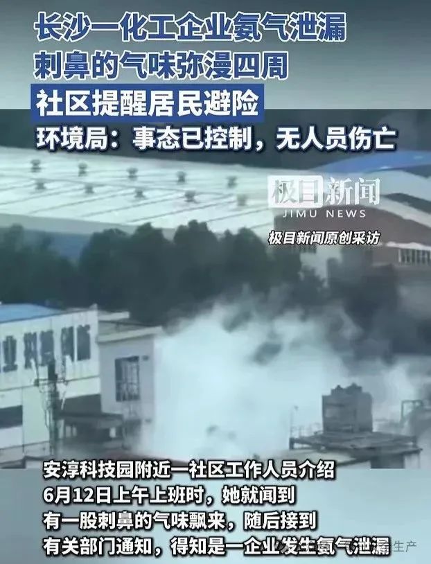 6月12日,有消息称长沙岳麓区一化工企业发生氨气泄漏事故,周边幼儿园师生被疏散。
