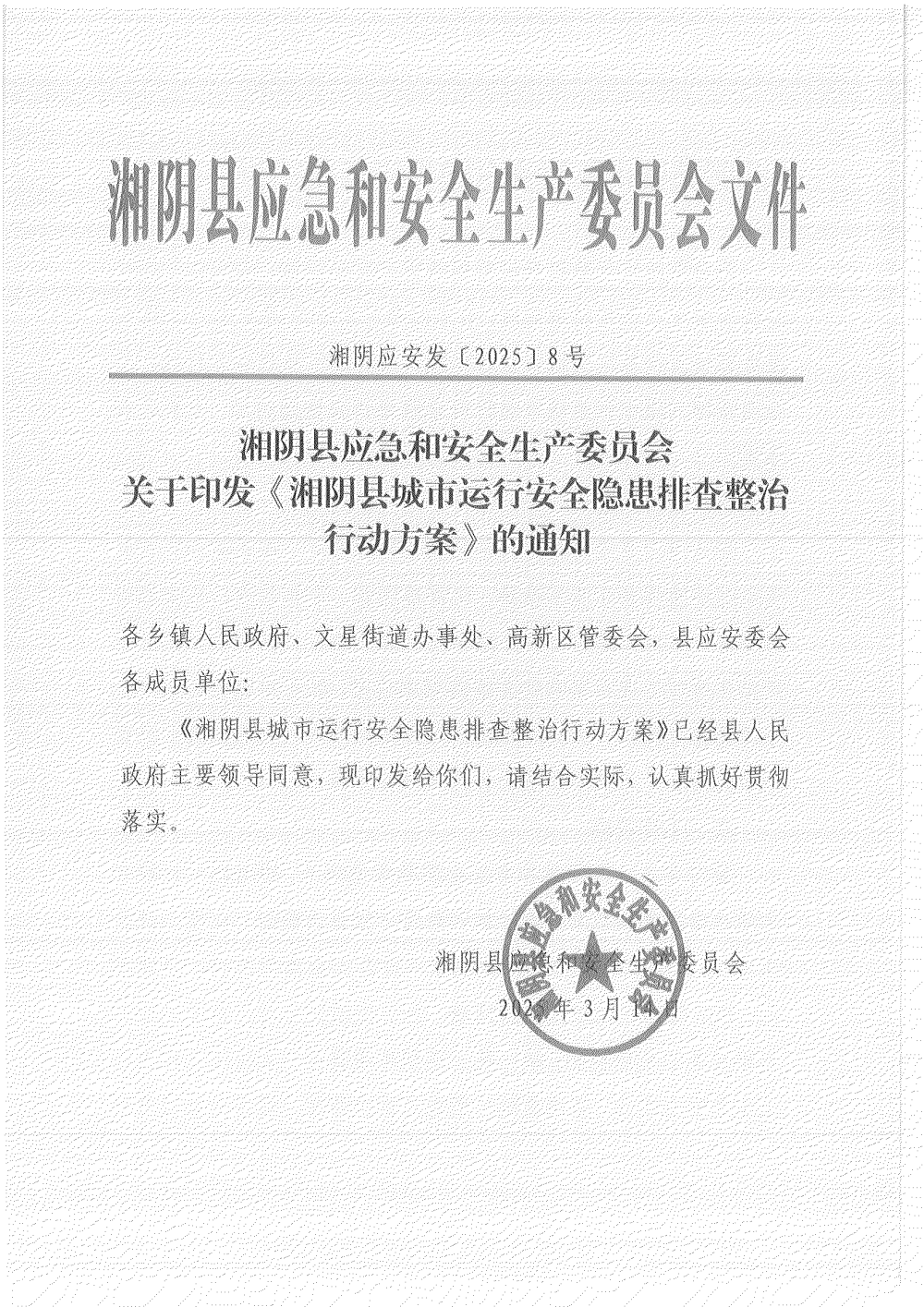 关于印发《湘阴县城市运行安全隐患排查整治行动方案》的通知