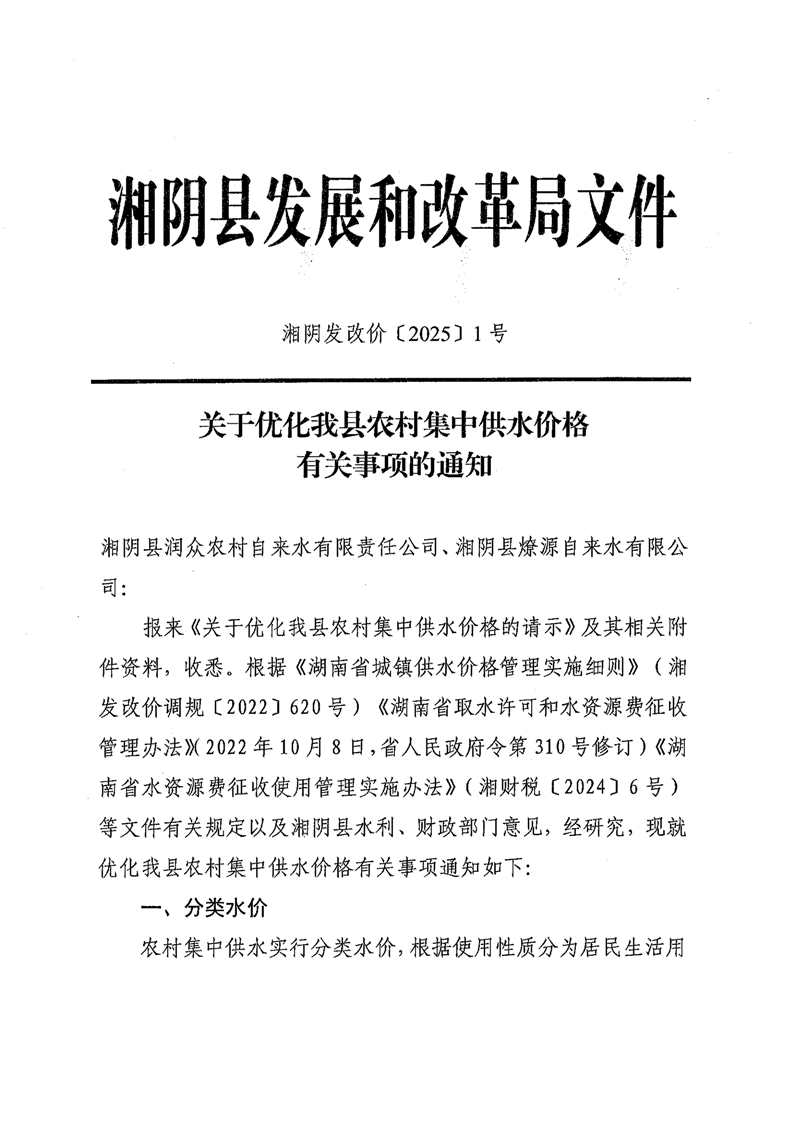 关于优化我县农村集中供水价格有关事项的通知 湘阴发改价〔2025〕 1号