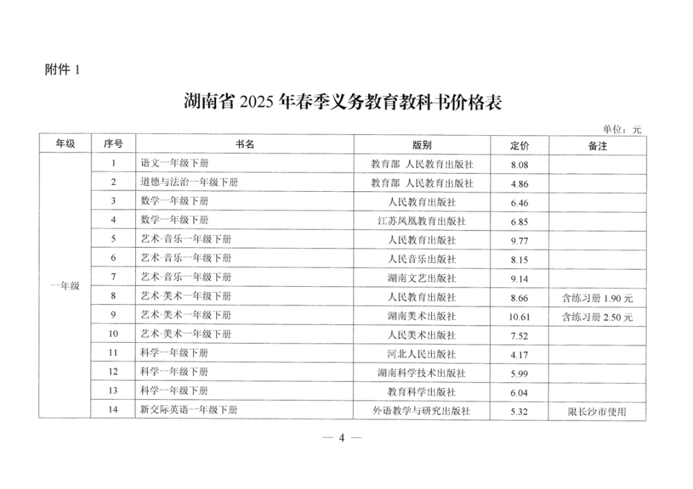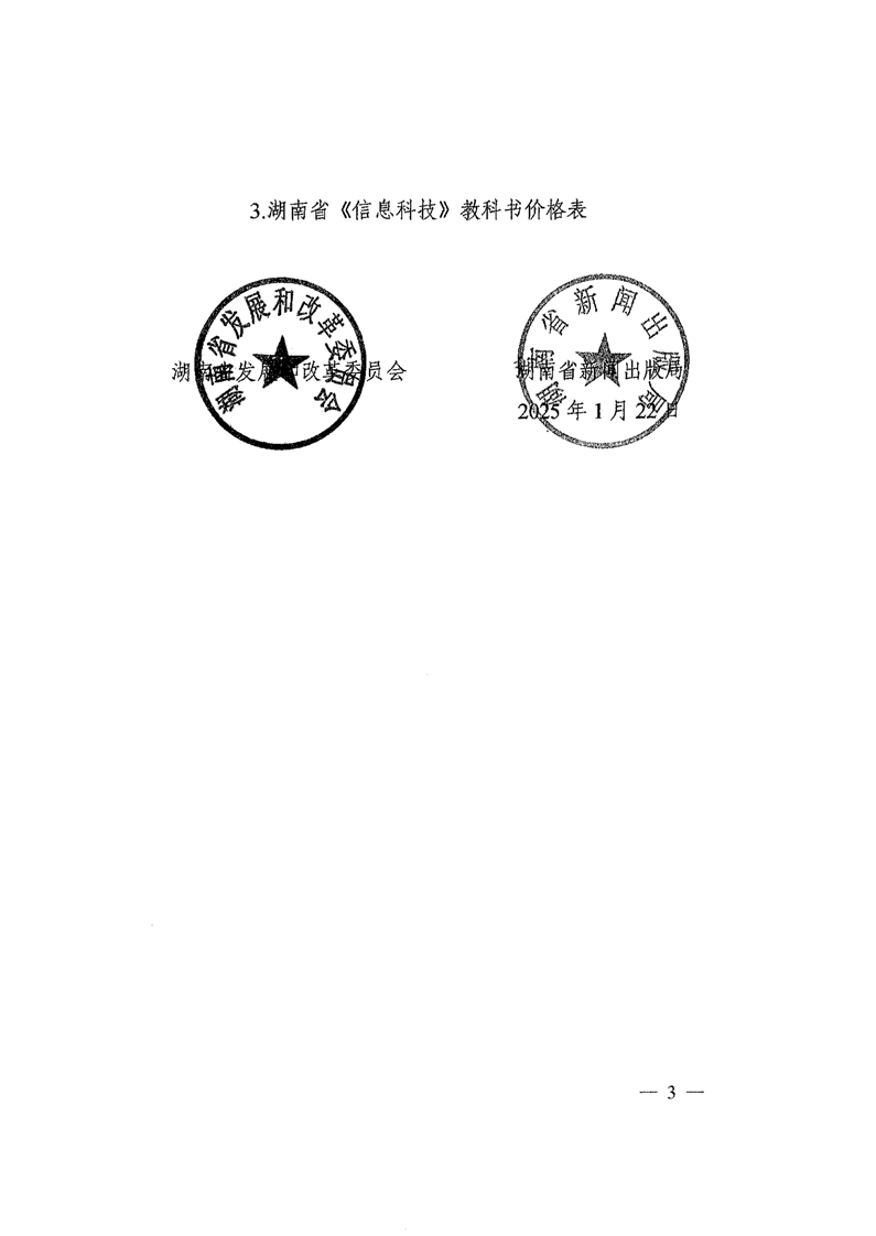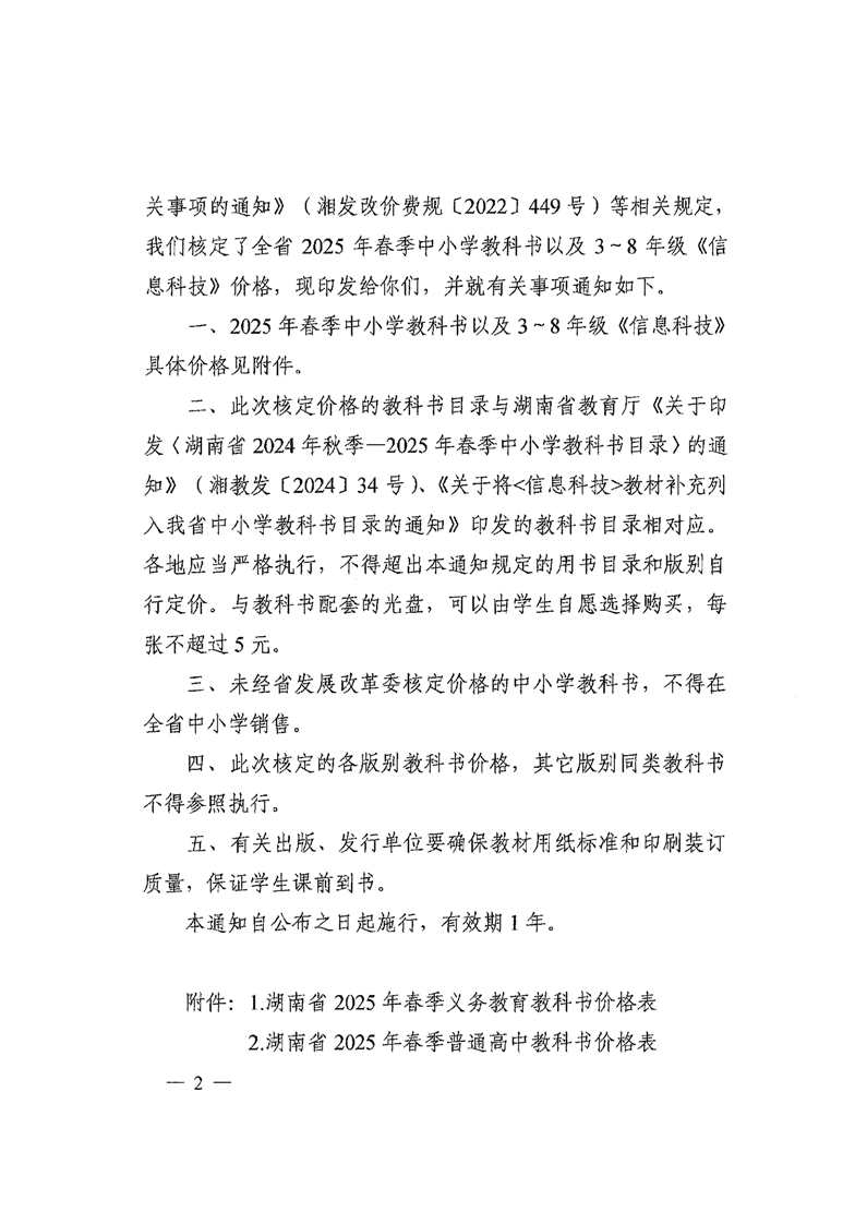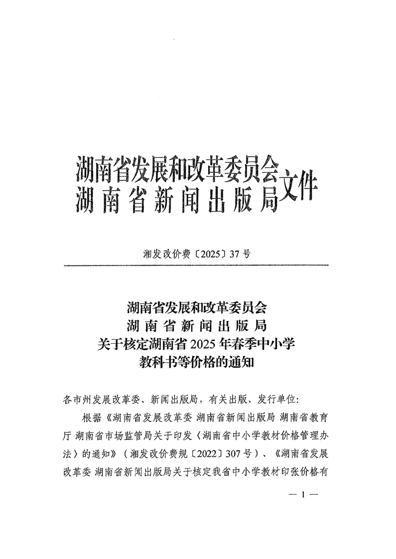 湖南省发展和改革委员会 湖南省新闻出版局 湘发改价费〔2025〕37号 关于核定湖南省2025年春季中小学教科书等价格的通知