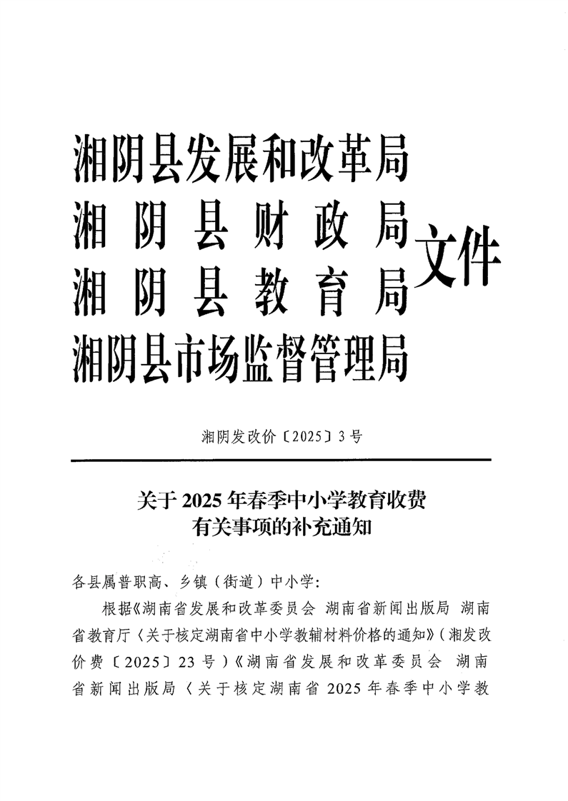 湘阴县发展和改革局 湘阴县财政局 湘阴县教育局 湘阴县市场监督管理局 湘阴发改价〔2025〕3号 关于2025年春季中小学教育收费有关事项的补充通知