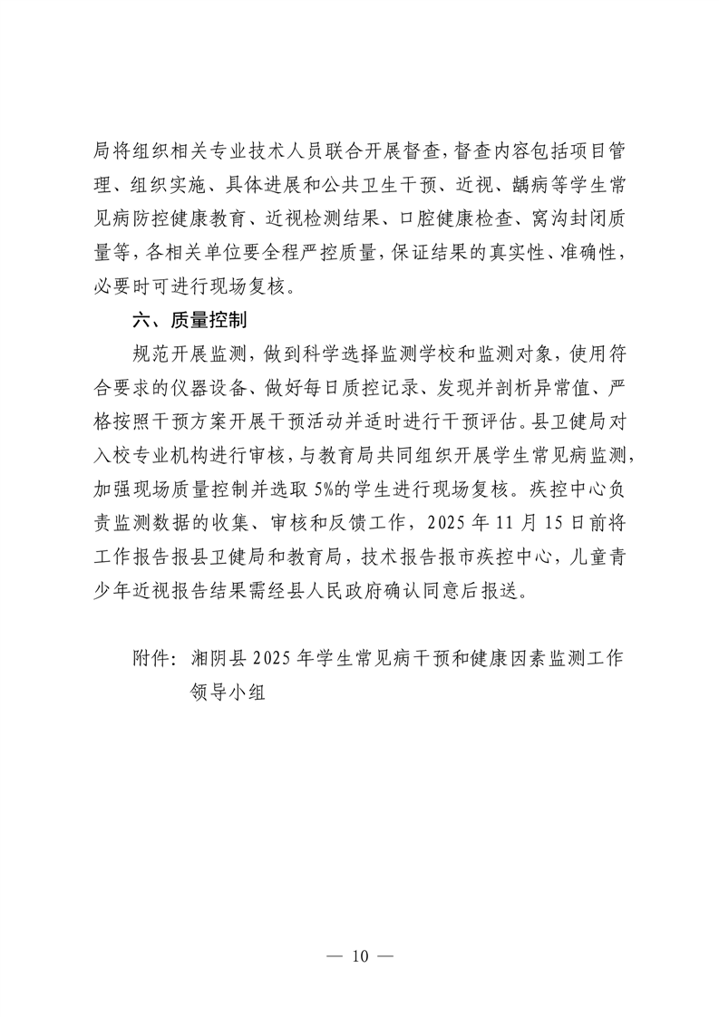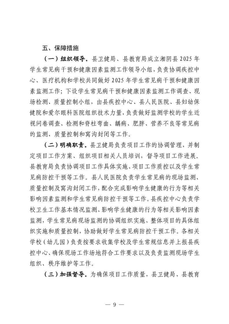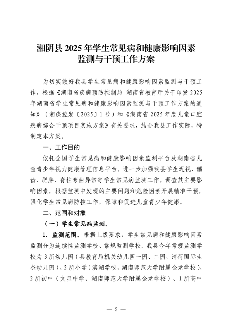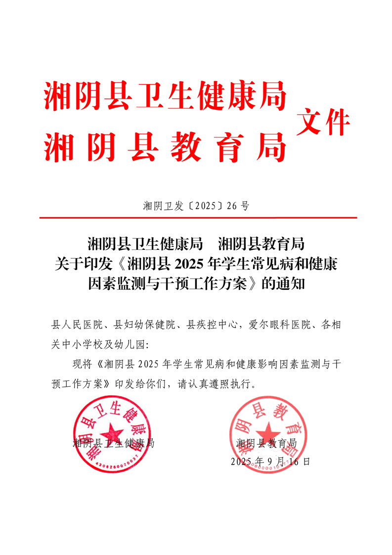 关于印发《湘阴县2025年学生常见病和健康因素监测与干预工作方案》的通知