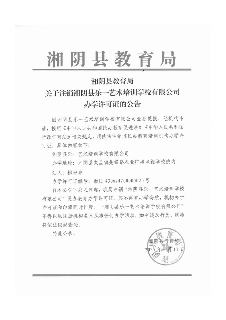 关于注销湘阴县乐一艺术培训学校有限公司办学许可证的公告