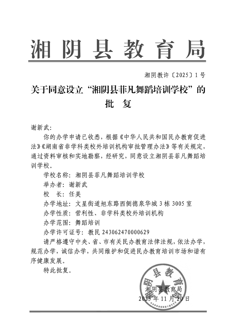 关于同意设立“湘阴县菲凡舞蹈培训学校”的批复
