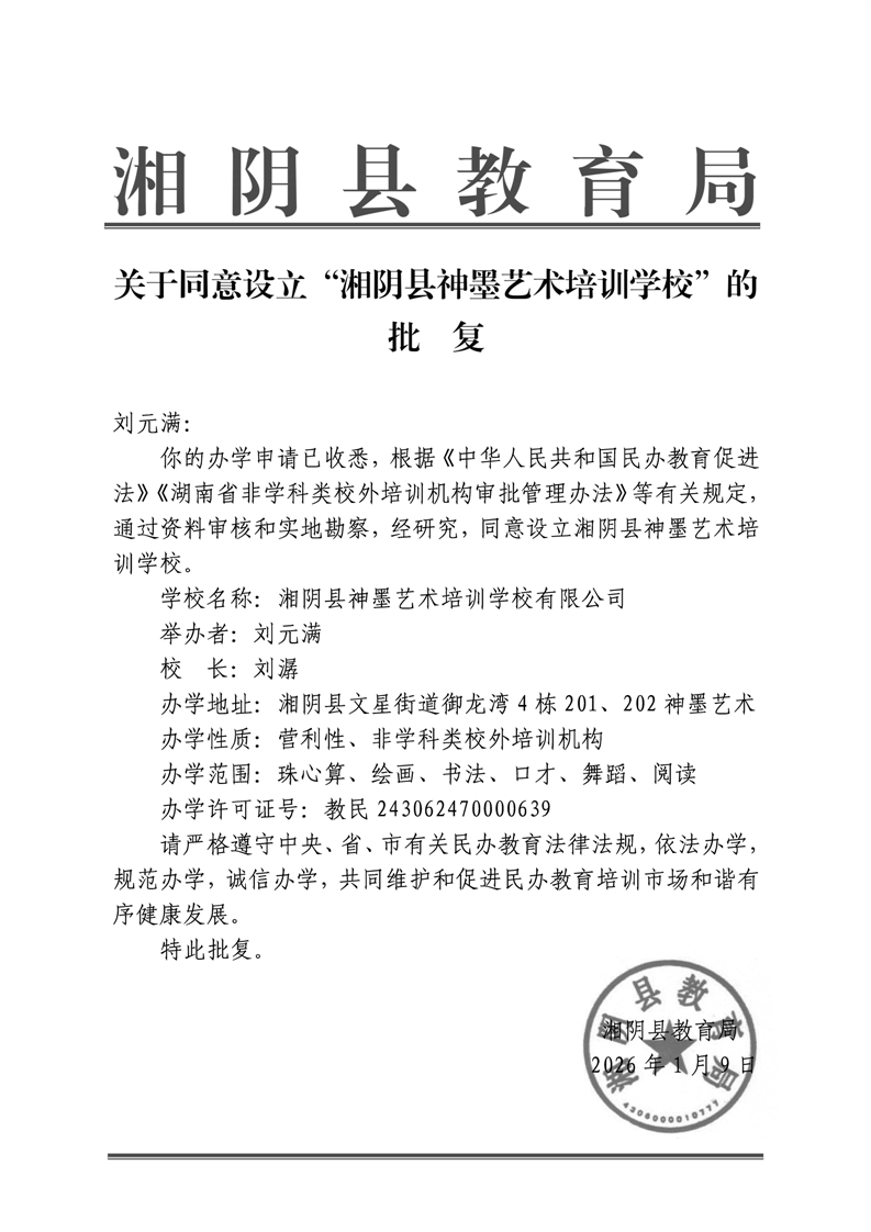 关于同意设立“湘阴县神墨艺术培训学校”的批复