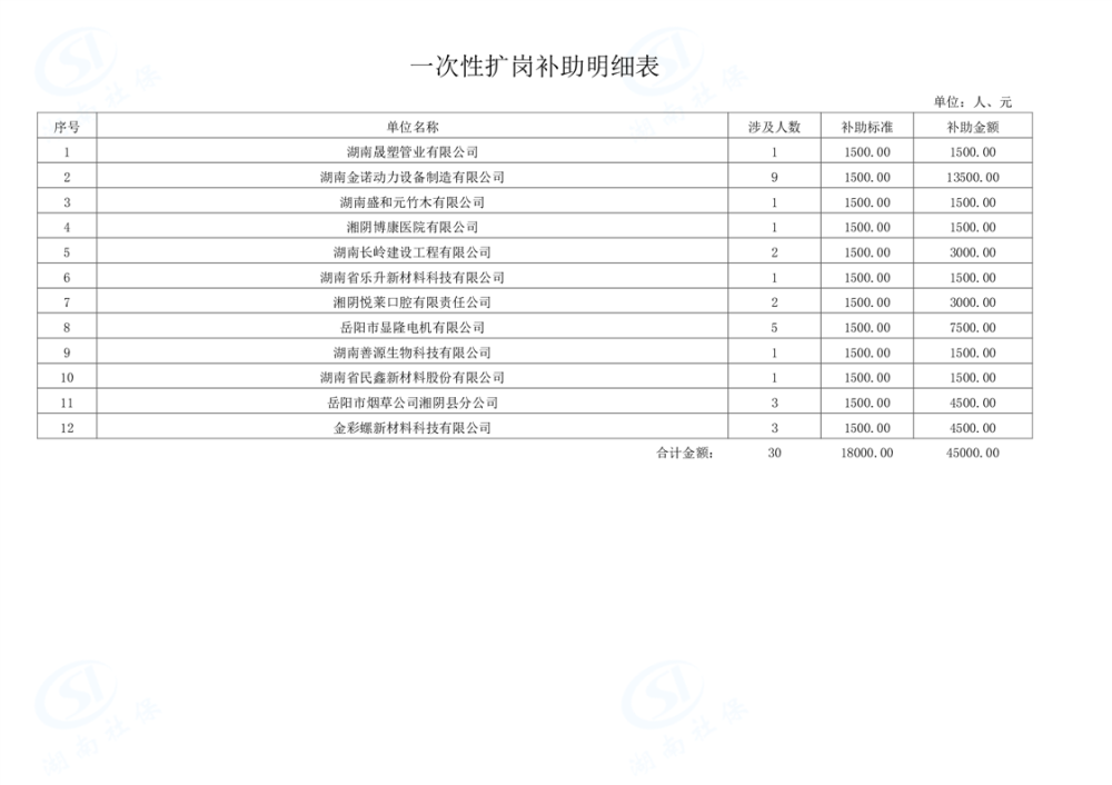 湘阴县2025年度9月一次性扩岗补贴名单公示