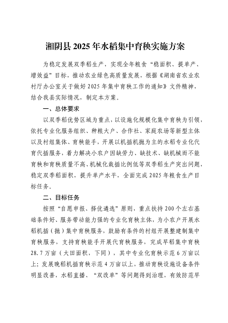 关于印发《湘阴县2025年水稻集中育秧实施方案》的通知