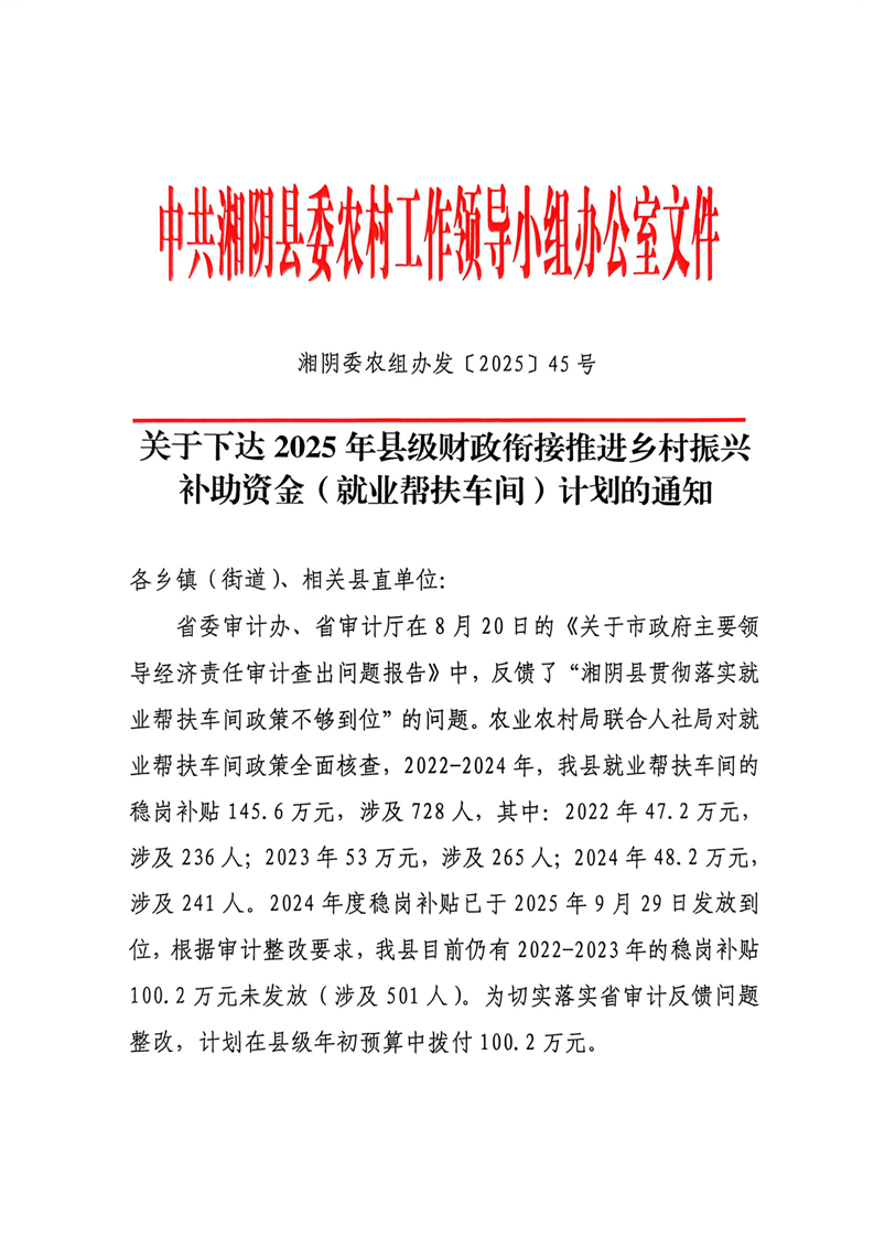 关于下达2025年县级财政衔接推进乡村振兴补助资金(就业帮扶车间)计划的通知