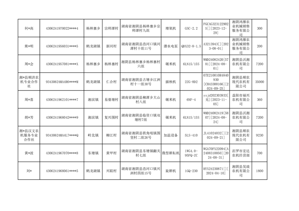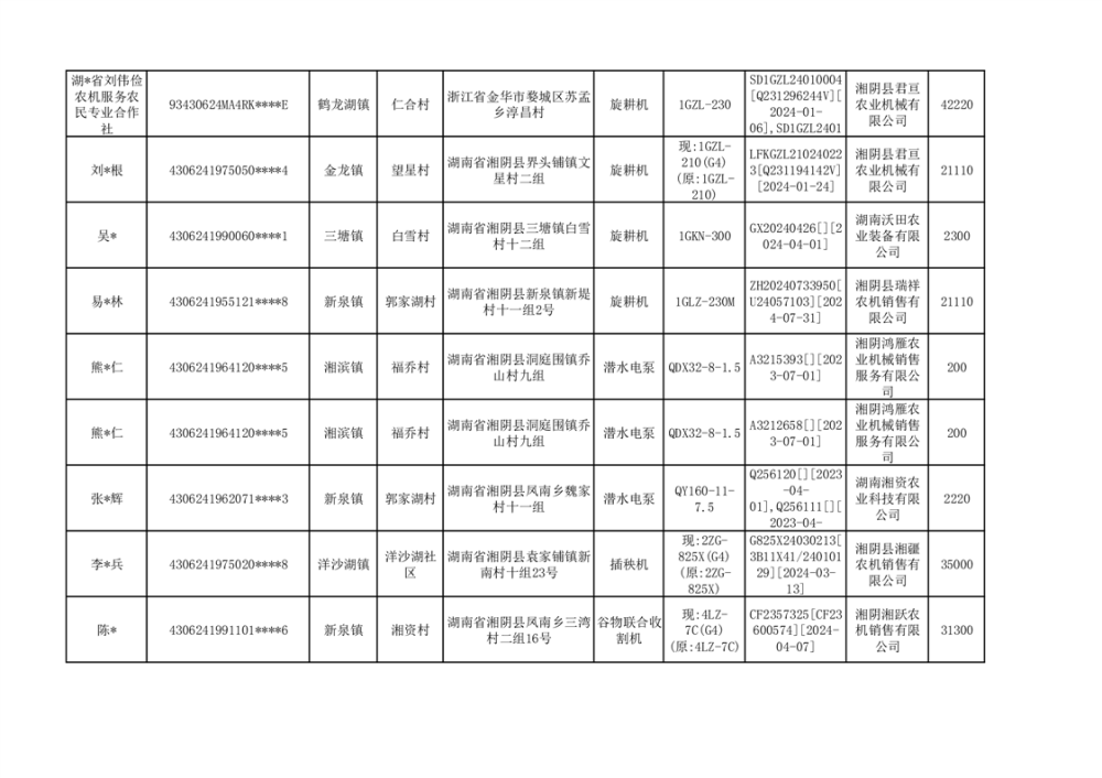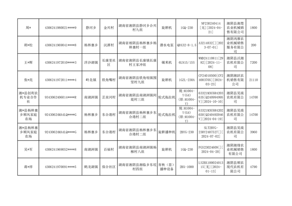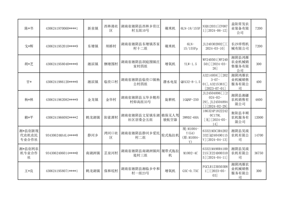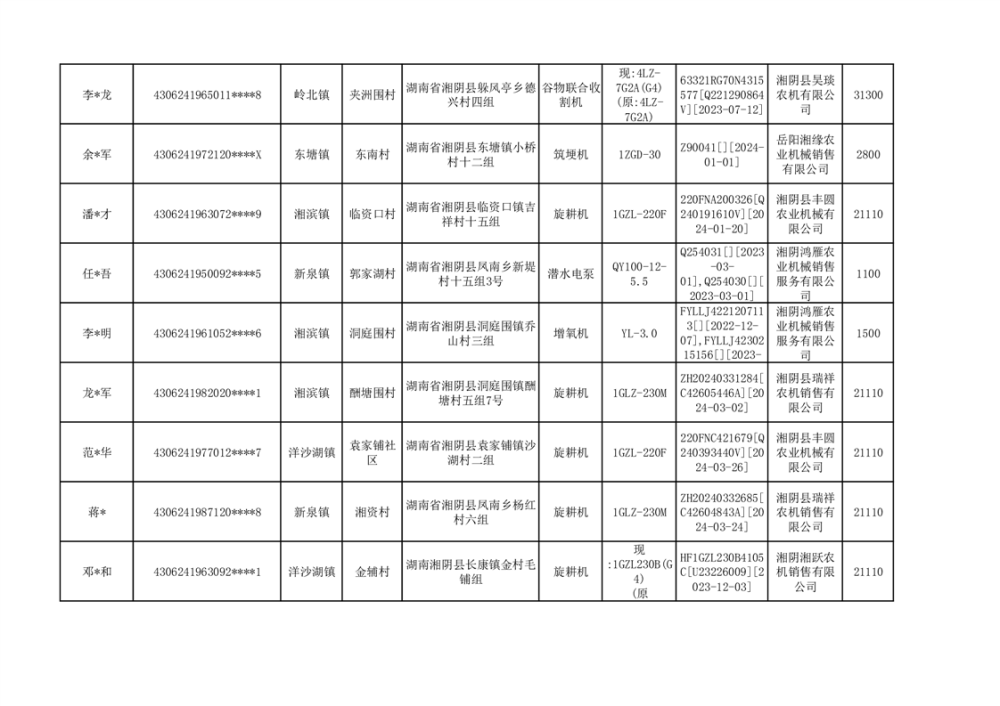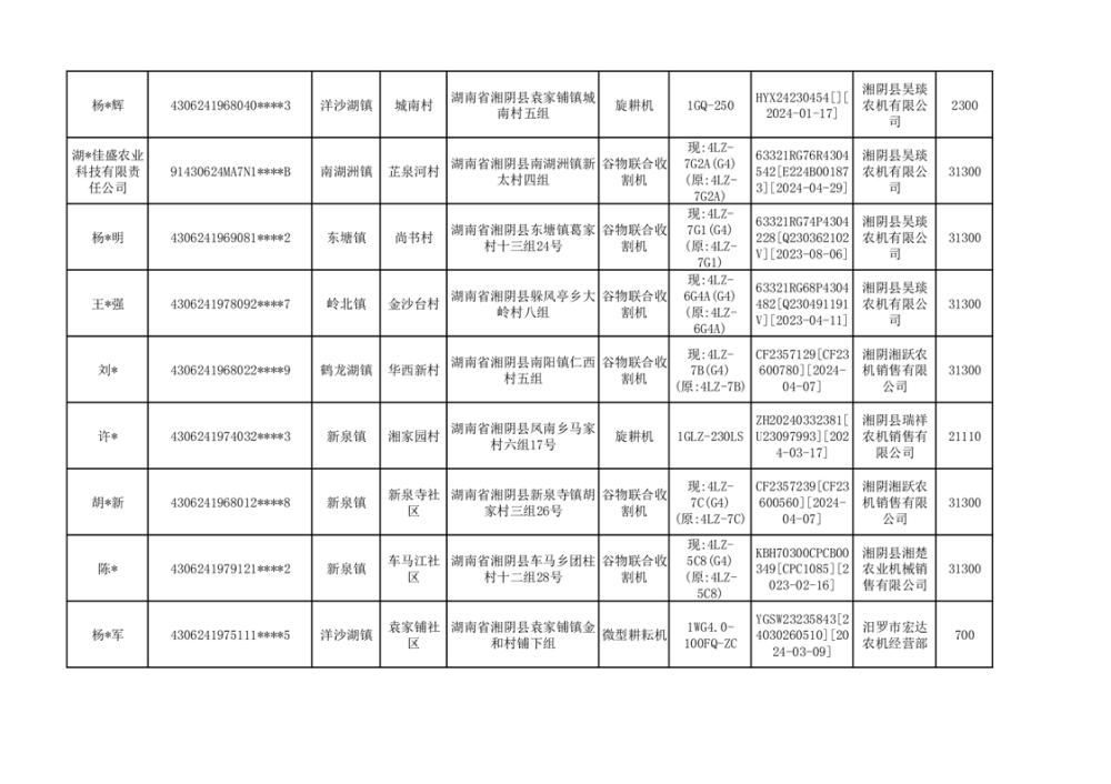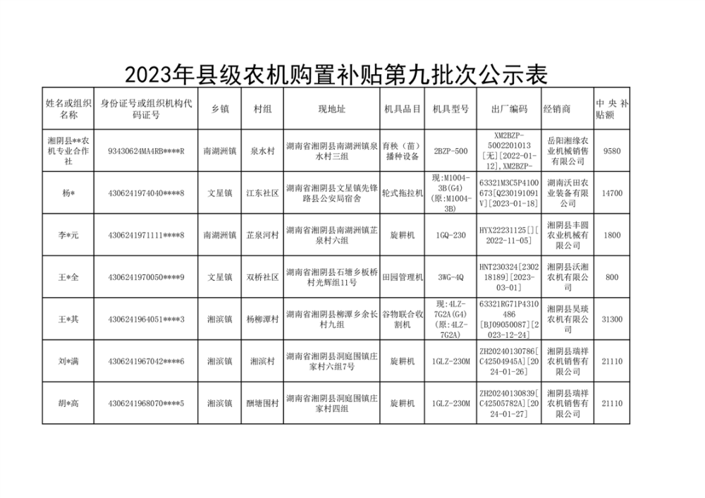 2023年湘阴县农机购置补贴资金公示(第九批)