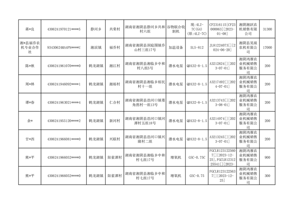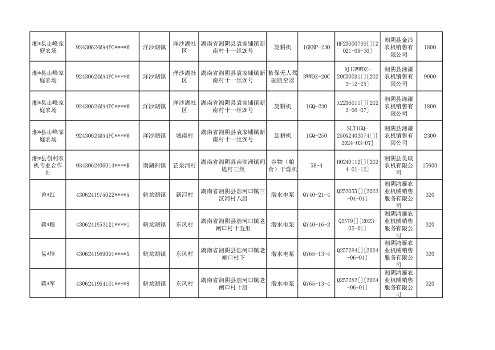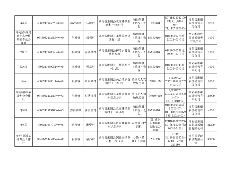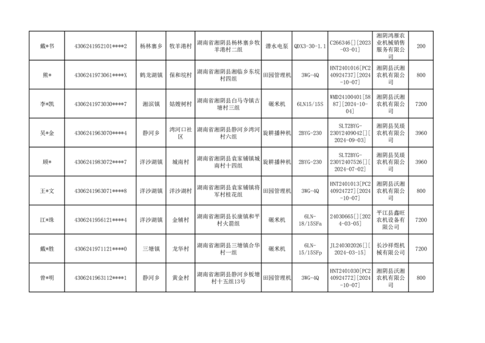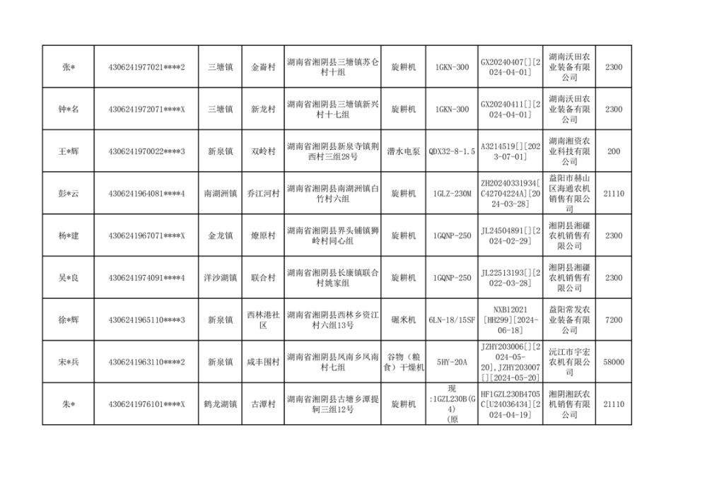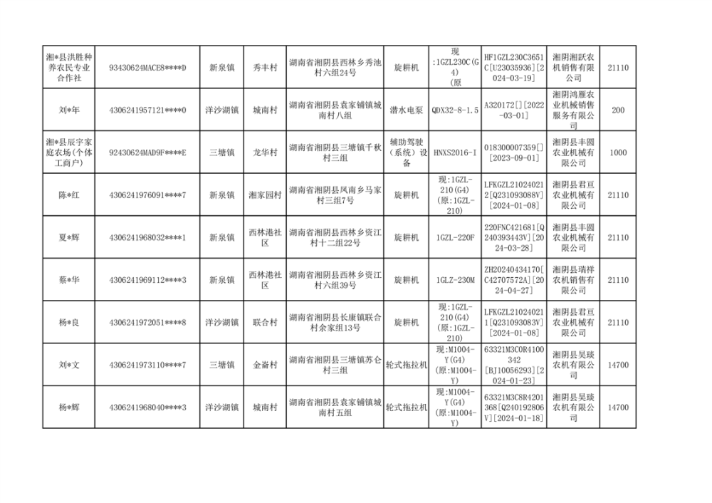 2023年湘阴县农机购置补贴资金公示(第九批)