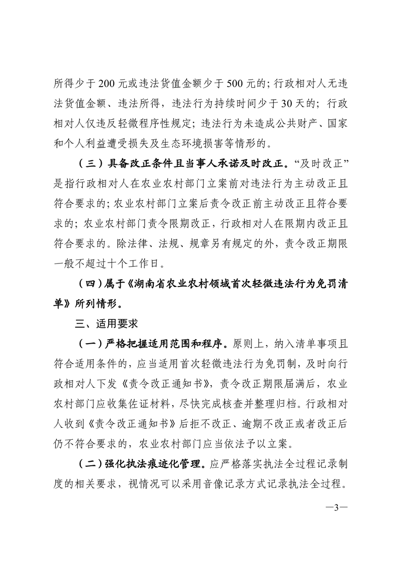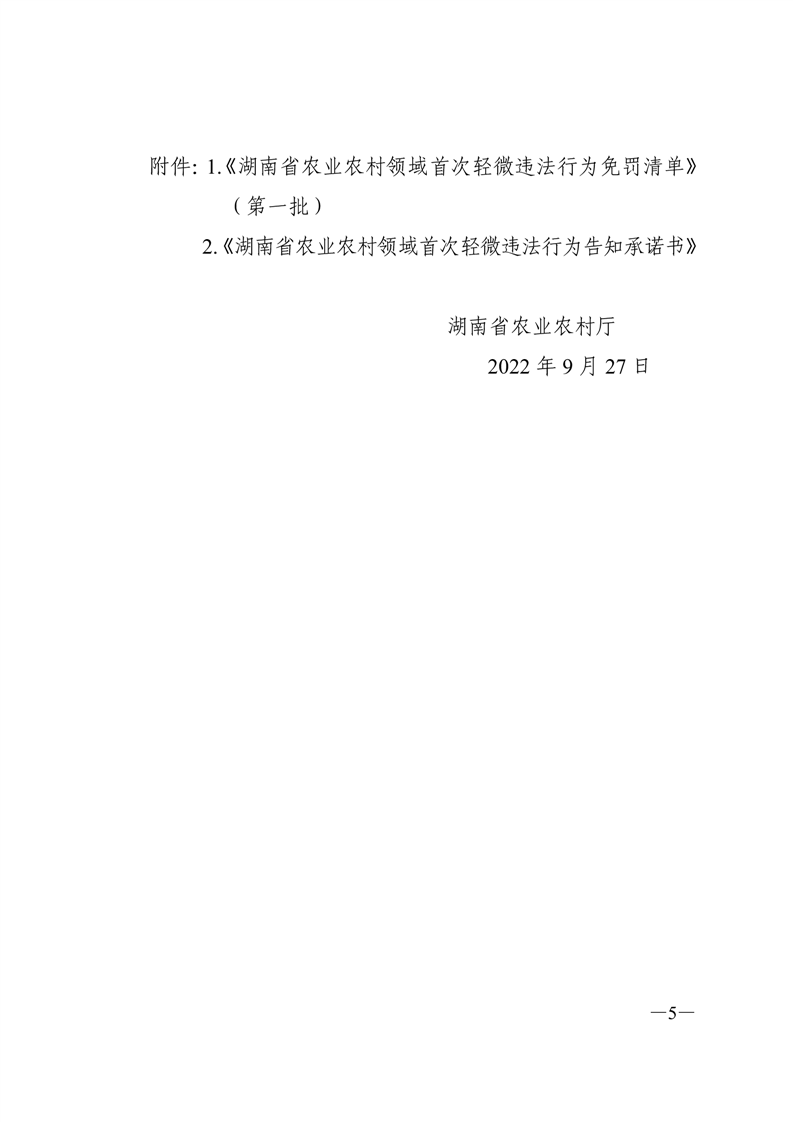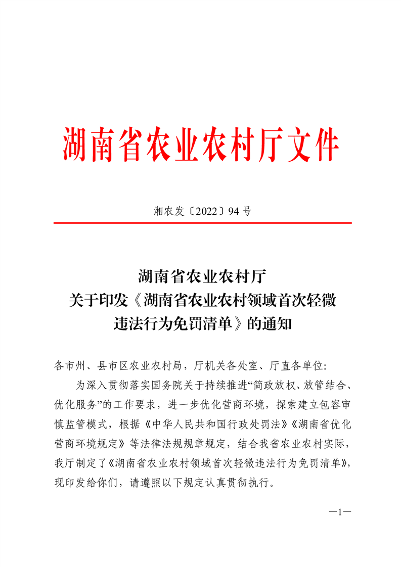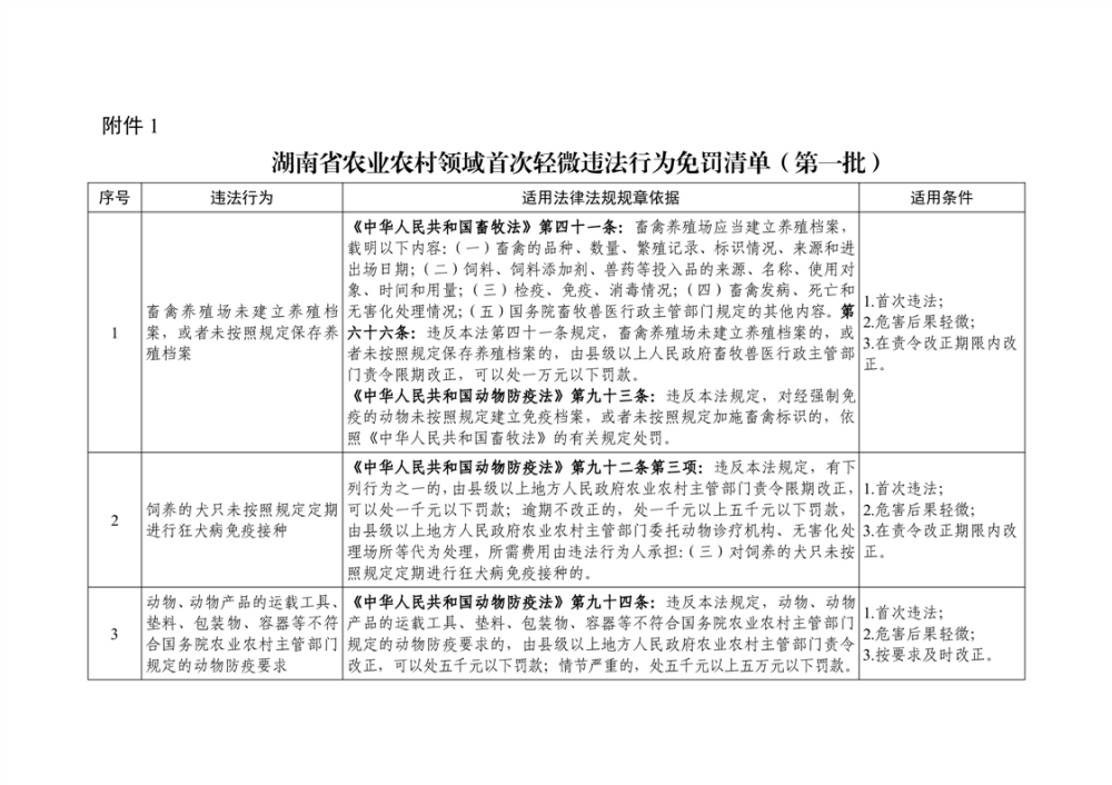 关于转发《湖南省农业农村领域首次轻微违法行为免罚清单的通知》《湖南省农业行政处罚自由裁量权适用规定》和《湖南省农业行政处罚自由裁量基准》的通知