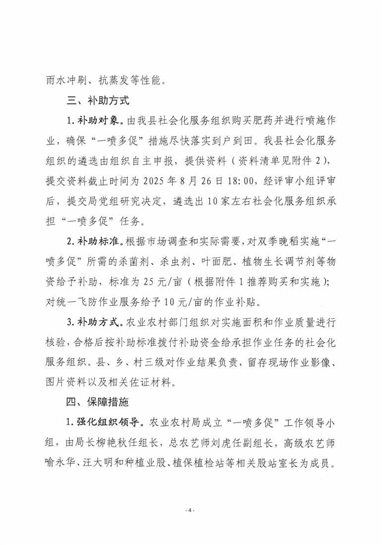 对双季晚稻实施“一喷多促”所需的杀菌剂、杀虫剂、叶面肥、植物生长调节剂等物资给予补助,标准为25元/亩(用药推荐参考《湖南省2025年秋粮“一喷多促”实施方案》(湘农办发〔2025〕84号);对统一飞防作业服务给予10元/亩的作业补贴。