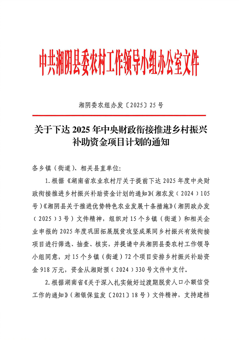 关于下达2025年中央财政衔接推进乡村振兴补助资金项目计划的通知