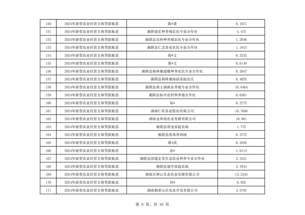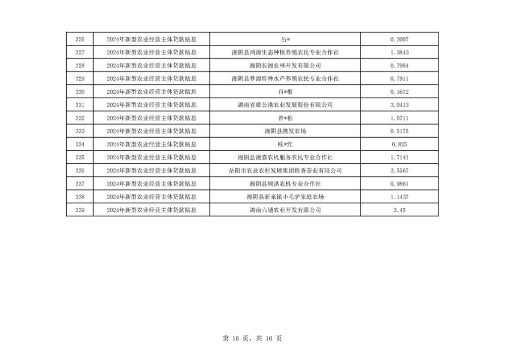 按照《关于印发新型农业经营主体贷款贴息工作实施方案的通知》(湘农联﹝2022﹞22号)文件精神,湖南省农业农村厅对县市区申报和市州审核的2024年度新型农业经营主体贷款贴息资料进行了抽查和汇总,于2025年9月11日下达了《关于下达2024年度新型农业经营主体贷款贴息明细的通知》,其中湘阴县有339家新型农业经营主体提交的资料通过了审核,共安排贷款贴息资金885.4382万元。