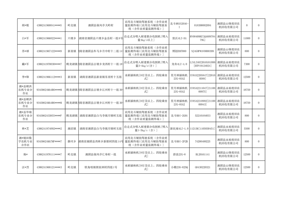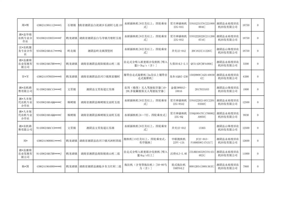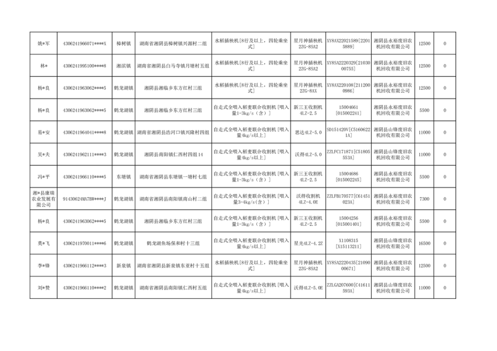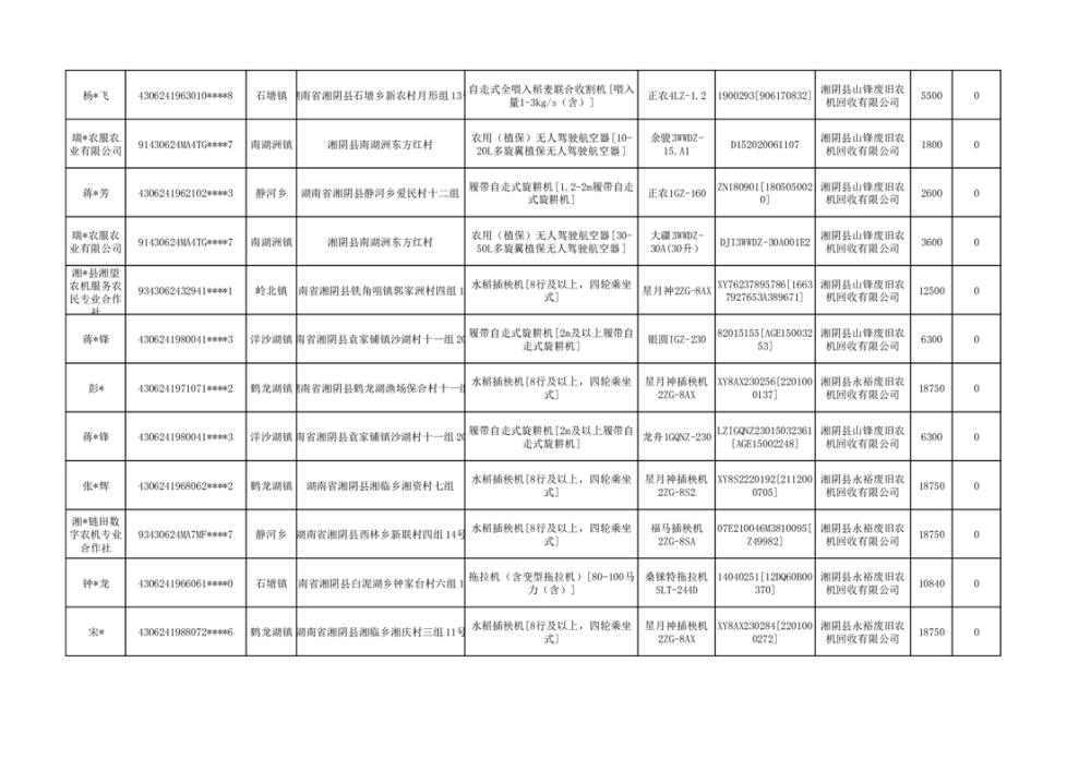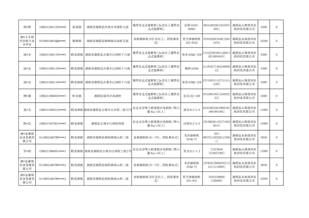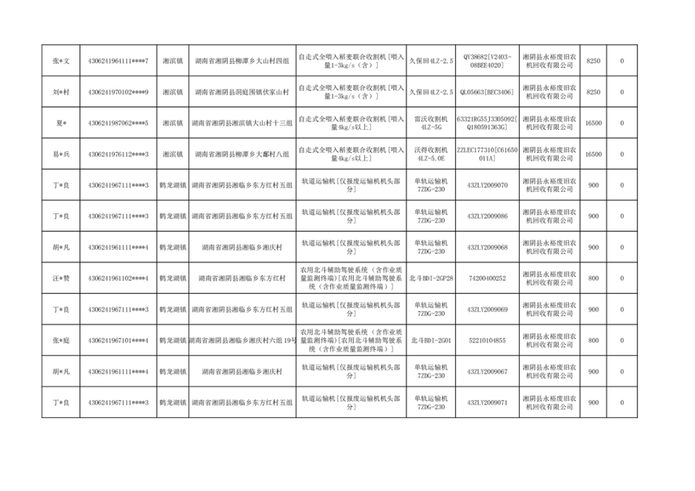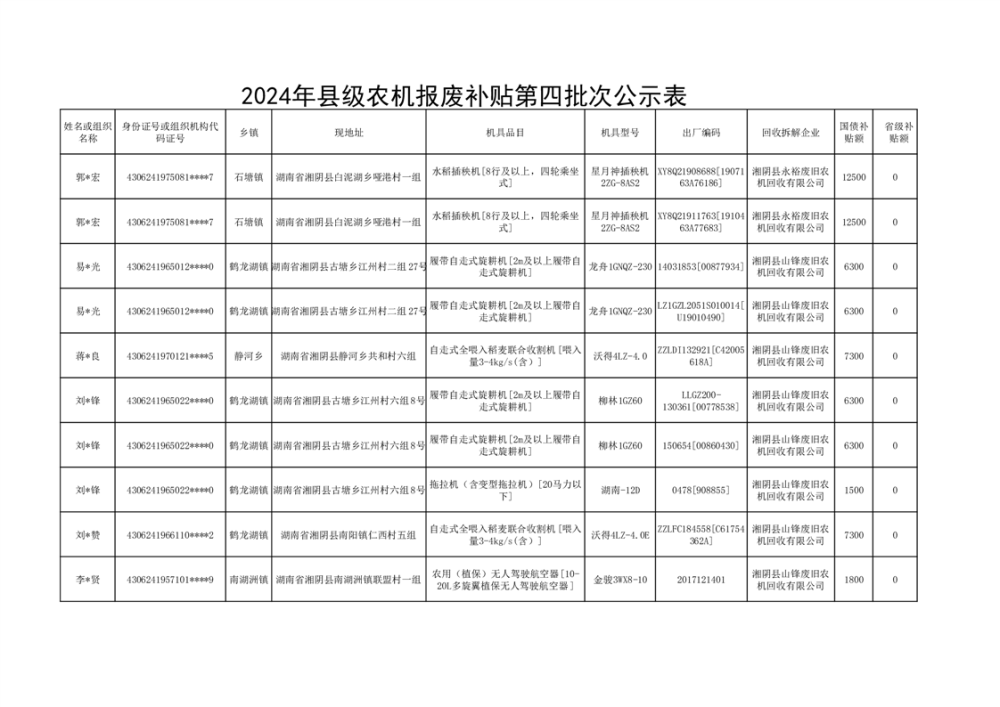 2024年湘阴县农机报废补贴资金公示(第四批)