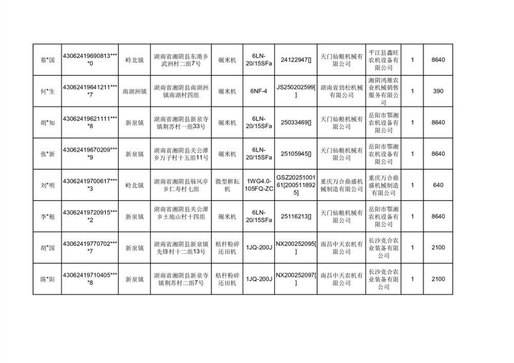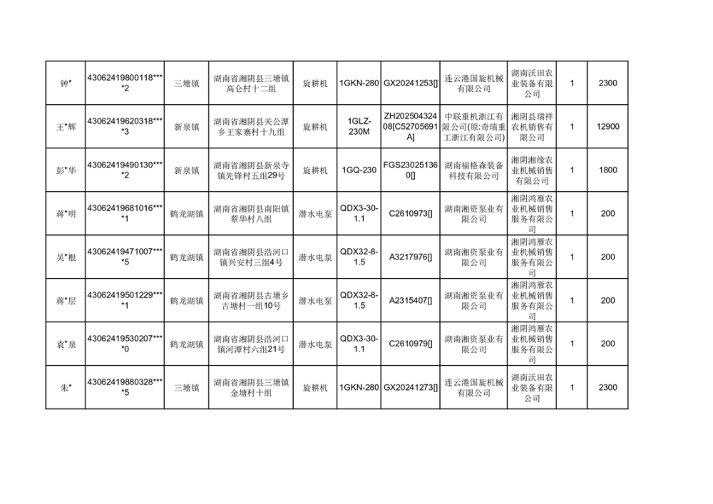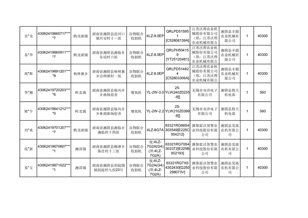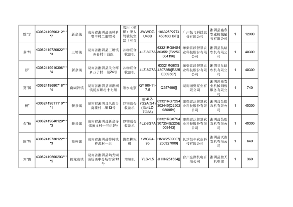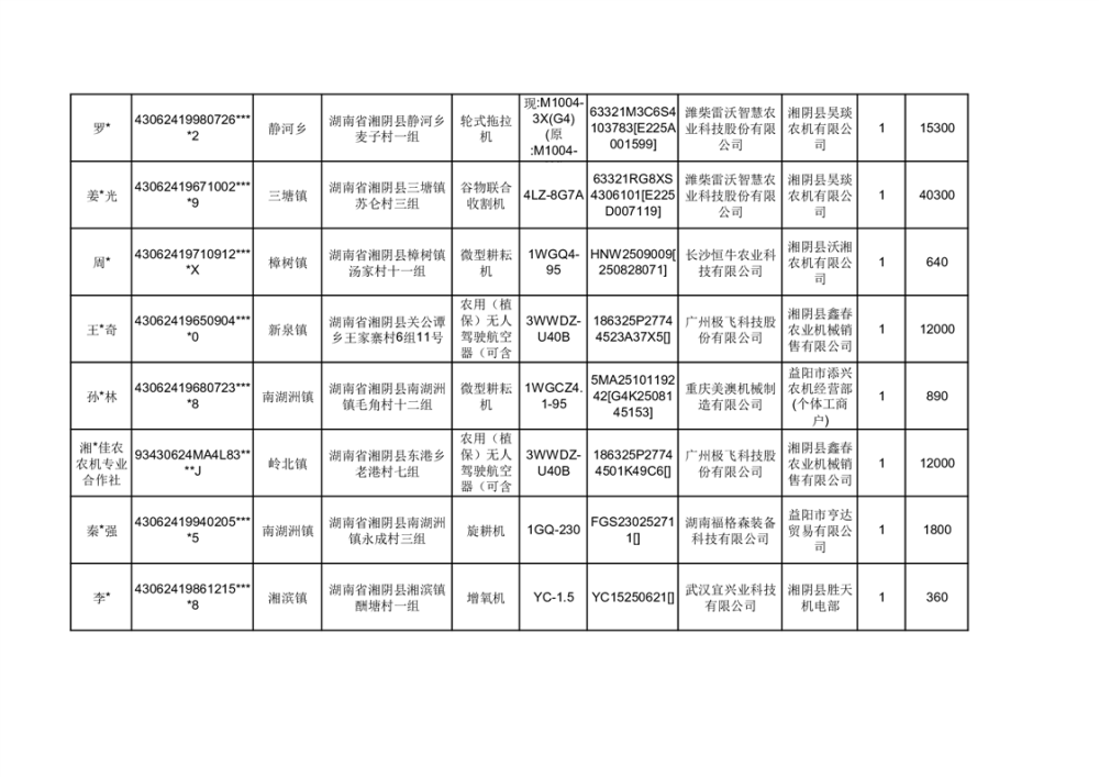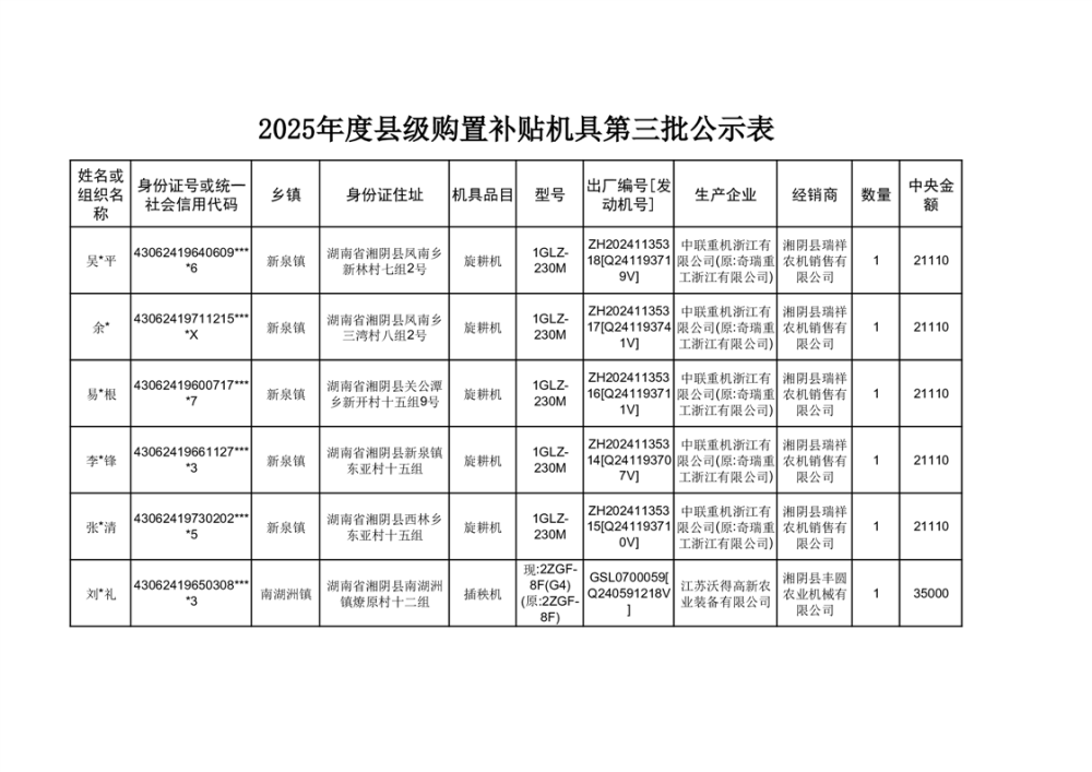 关于2025年湘阴县农机购置补贴资金公示(第三批)