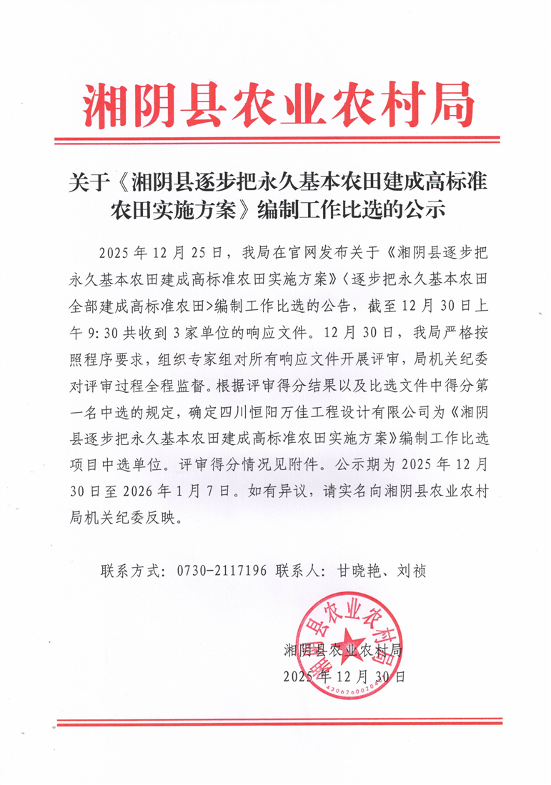 关于《湘阴县逐步把永久基本农田建成高标准农田实施方案》编制工作比选的公示