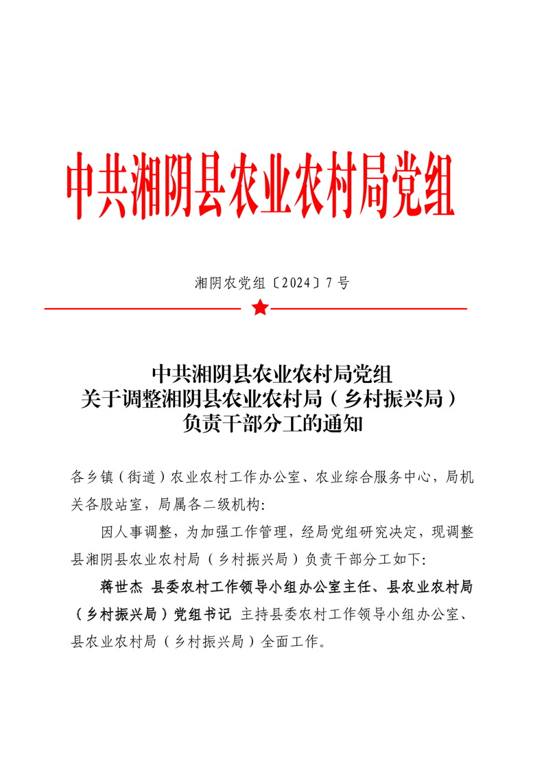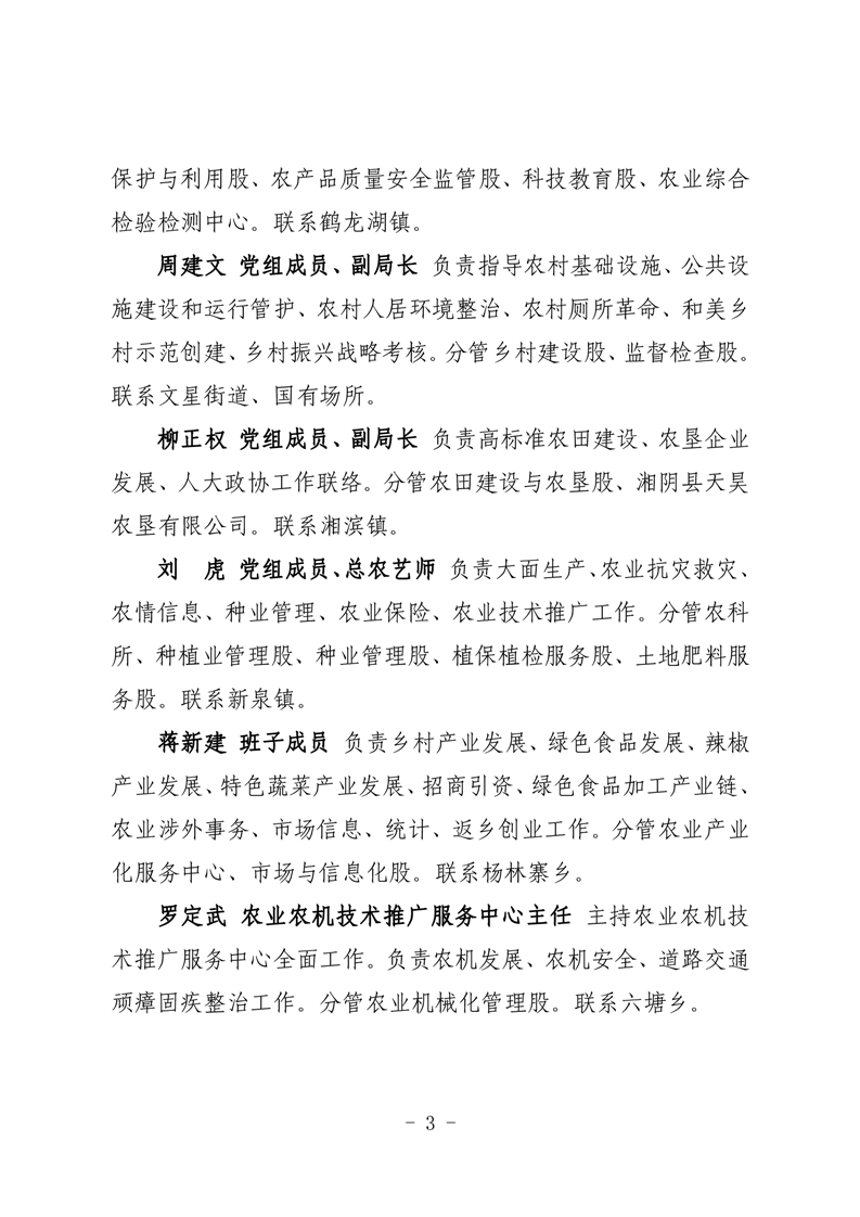 关于调整湘阴县农业农村局(乡村振兴局)负责干部分工的通知
