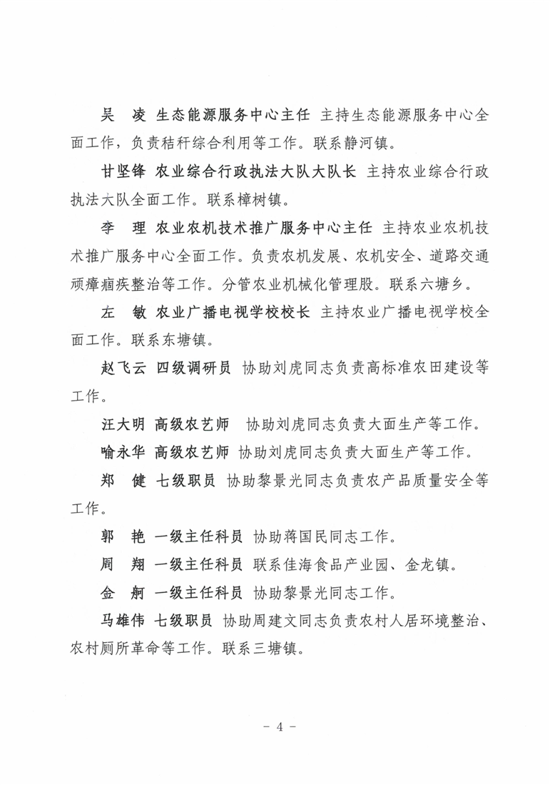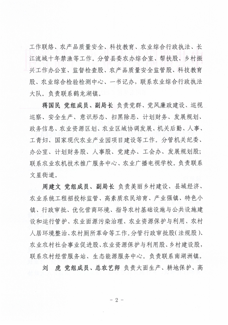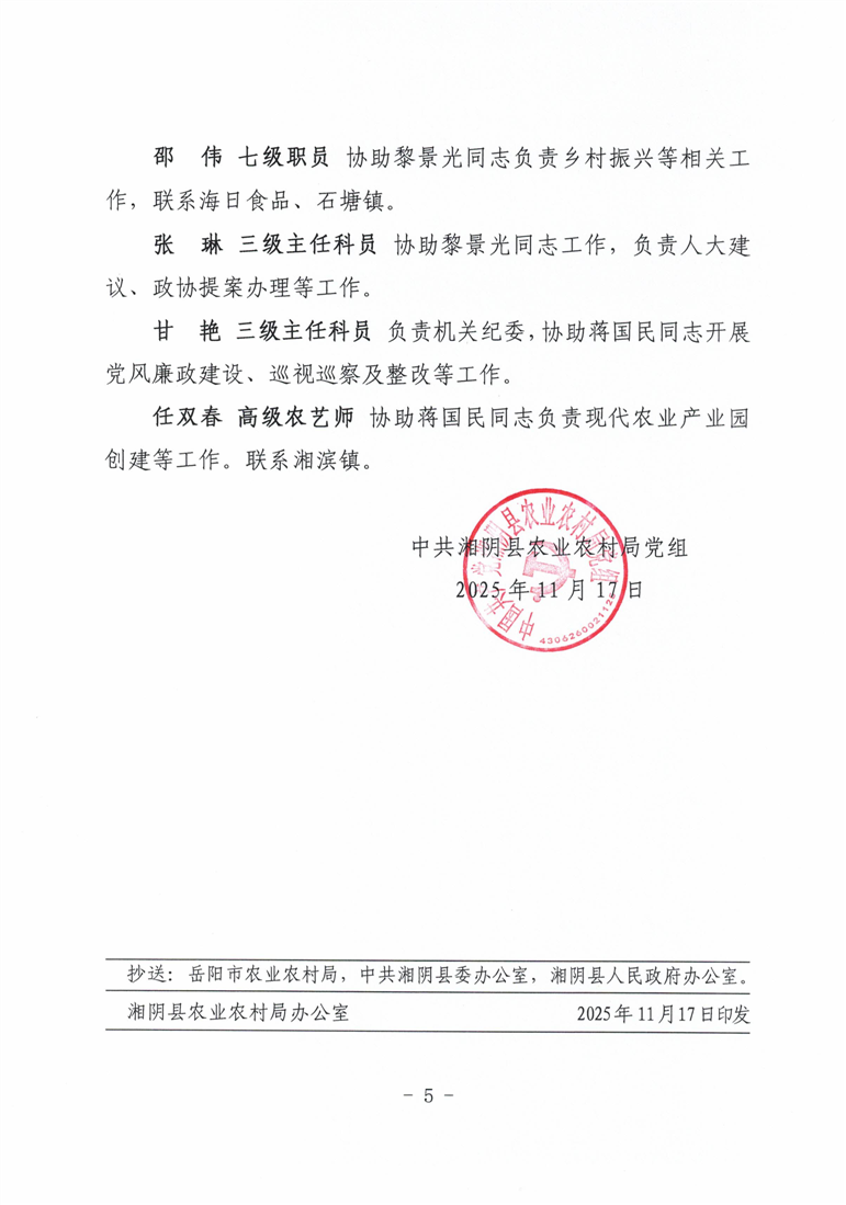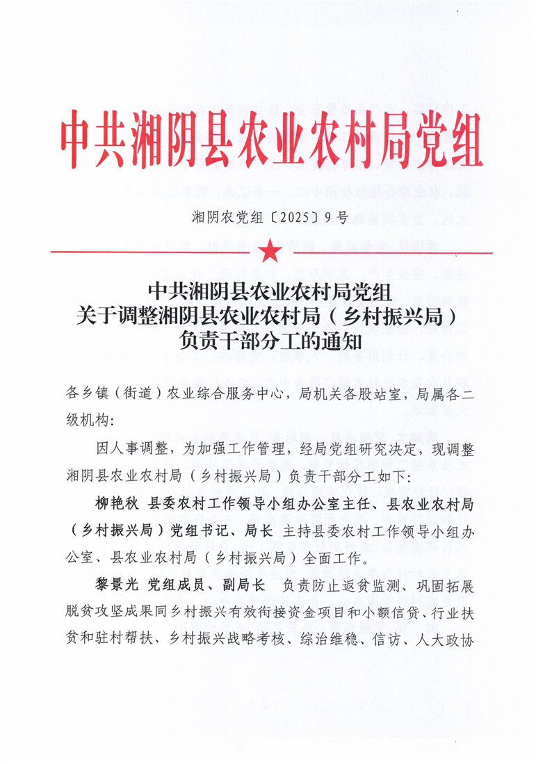 关于调整湘阴县农业农村局(乡村振兴局) 负责干部分工的通知