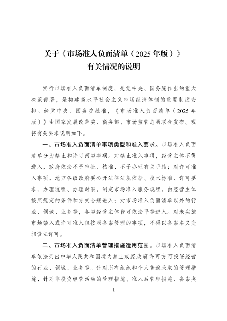 《市场准入负面清单(2025年版)》已经党中央、国务院批准,自即日起印发实施,请结合实际认真贯彻落实。2022年3月12日发布的《市场准入负面清单(2022年版)》(发改体改规〔2022〕397号)同时废止